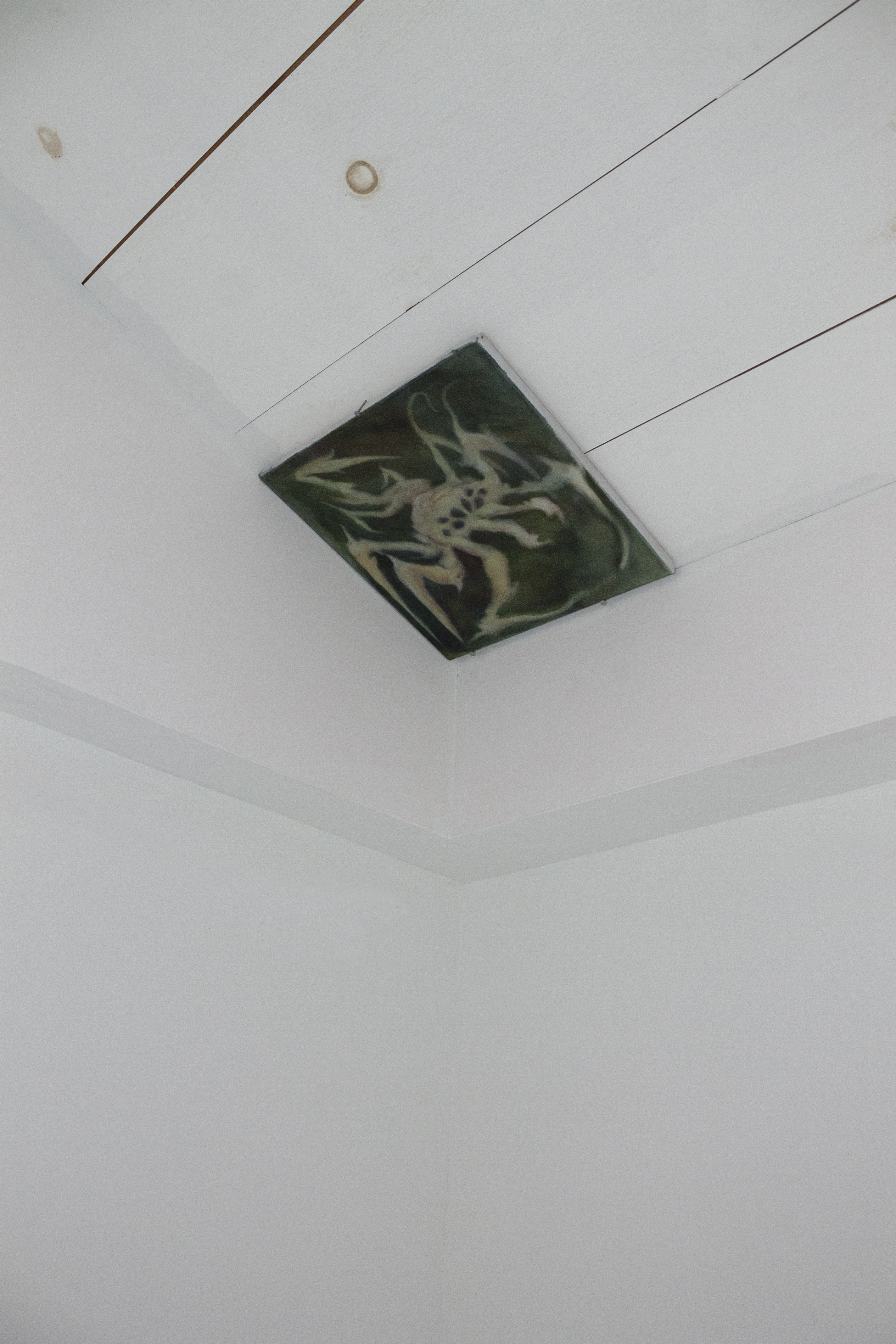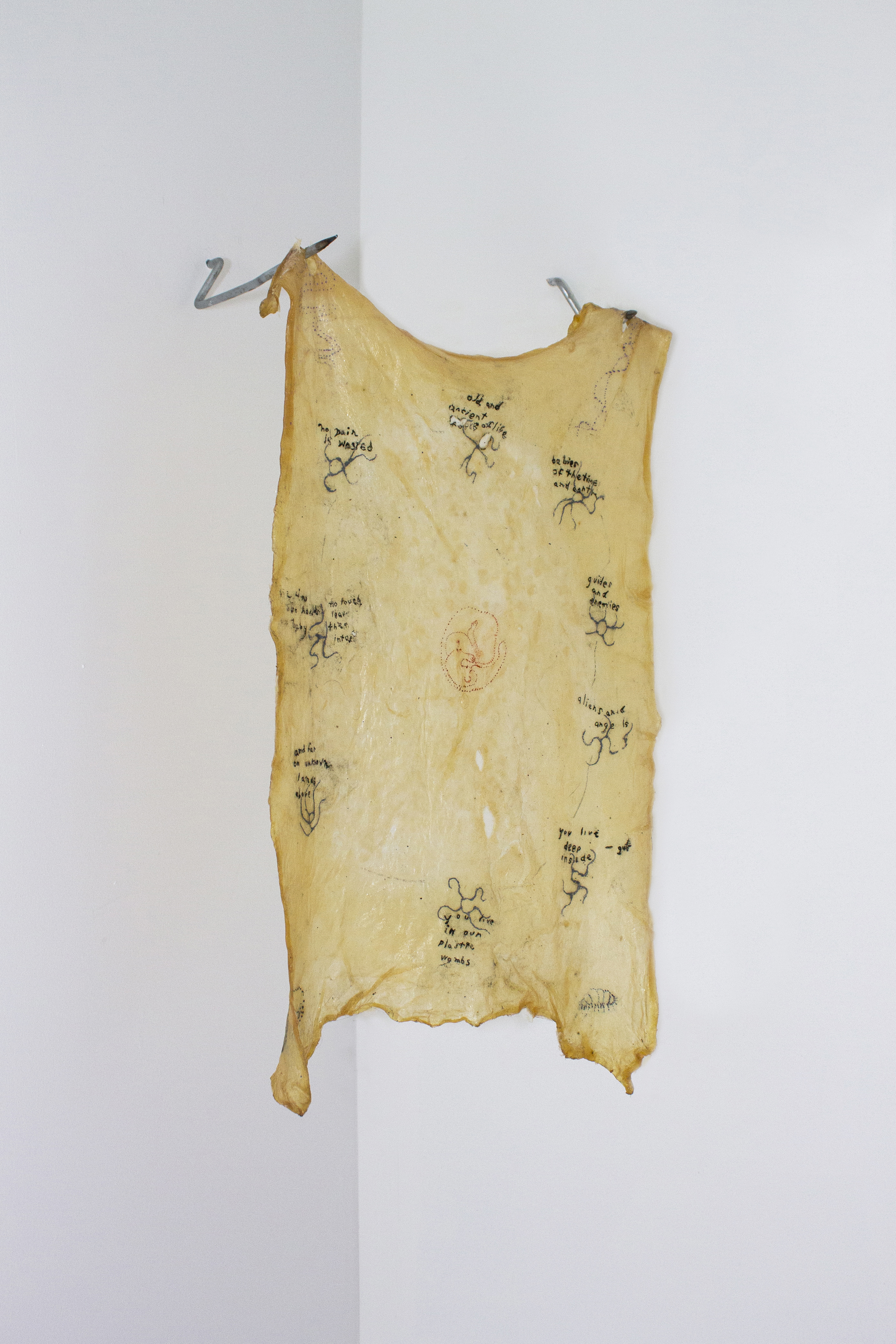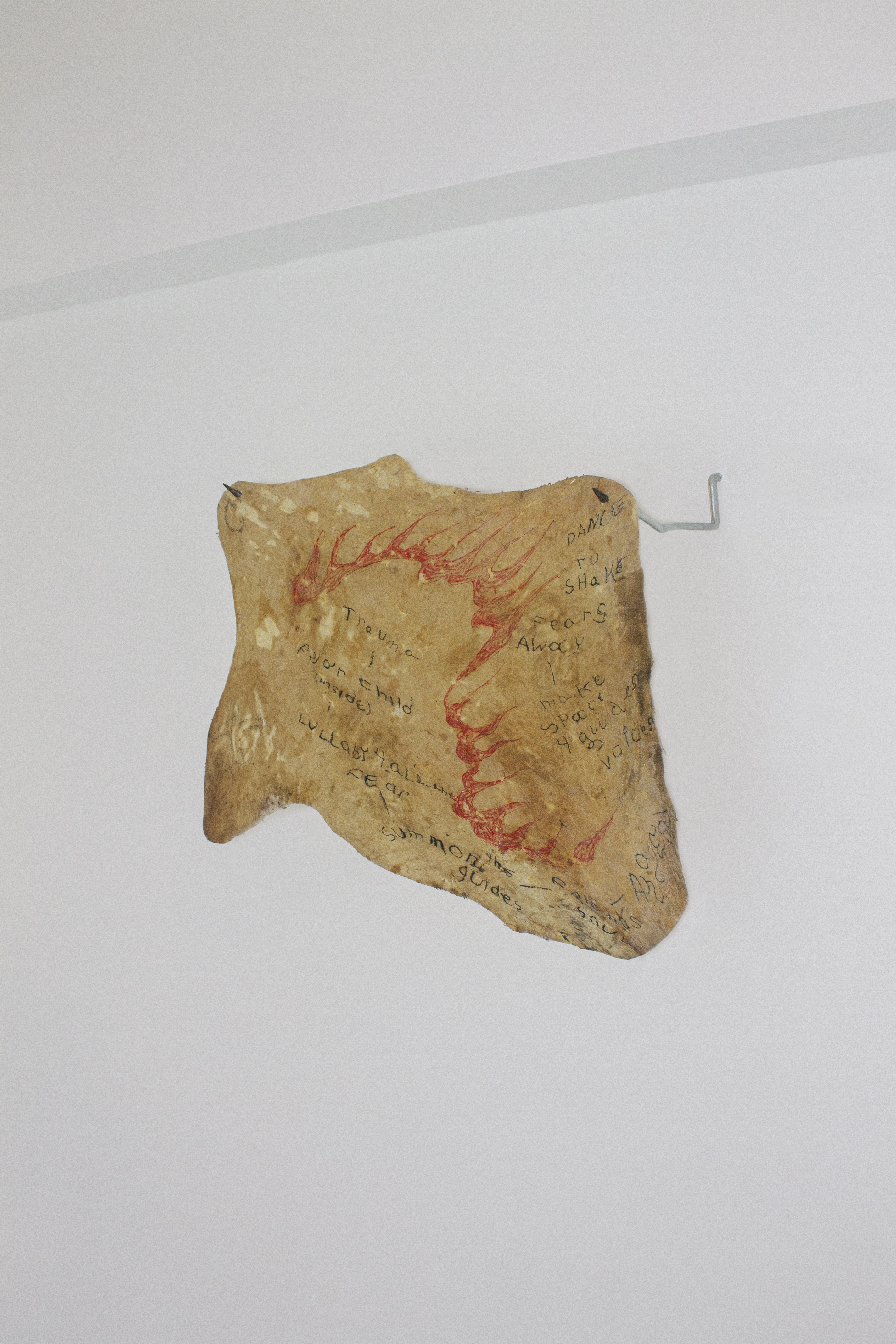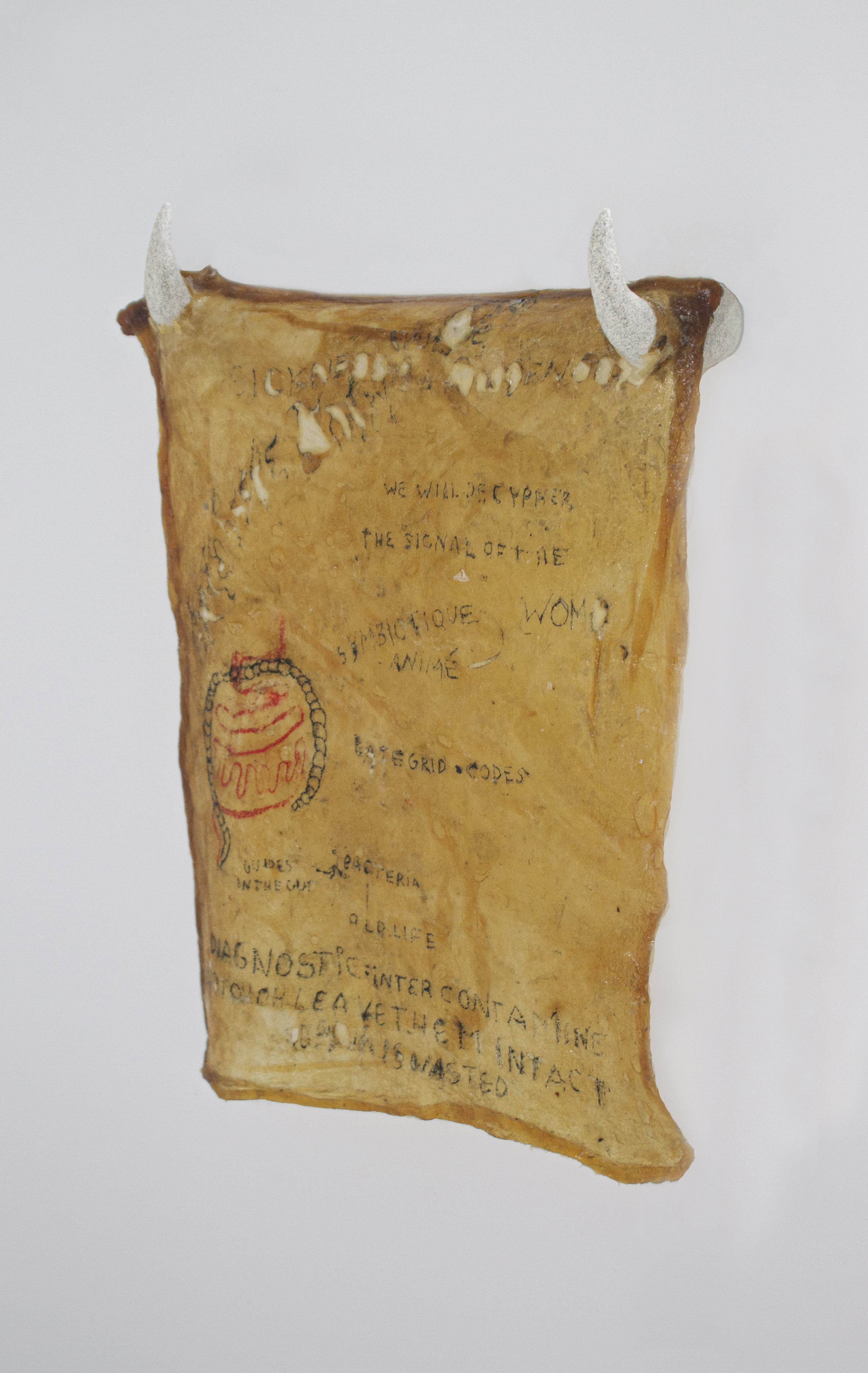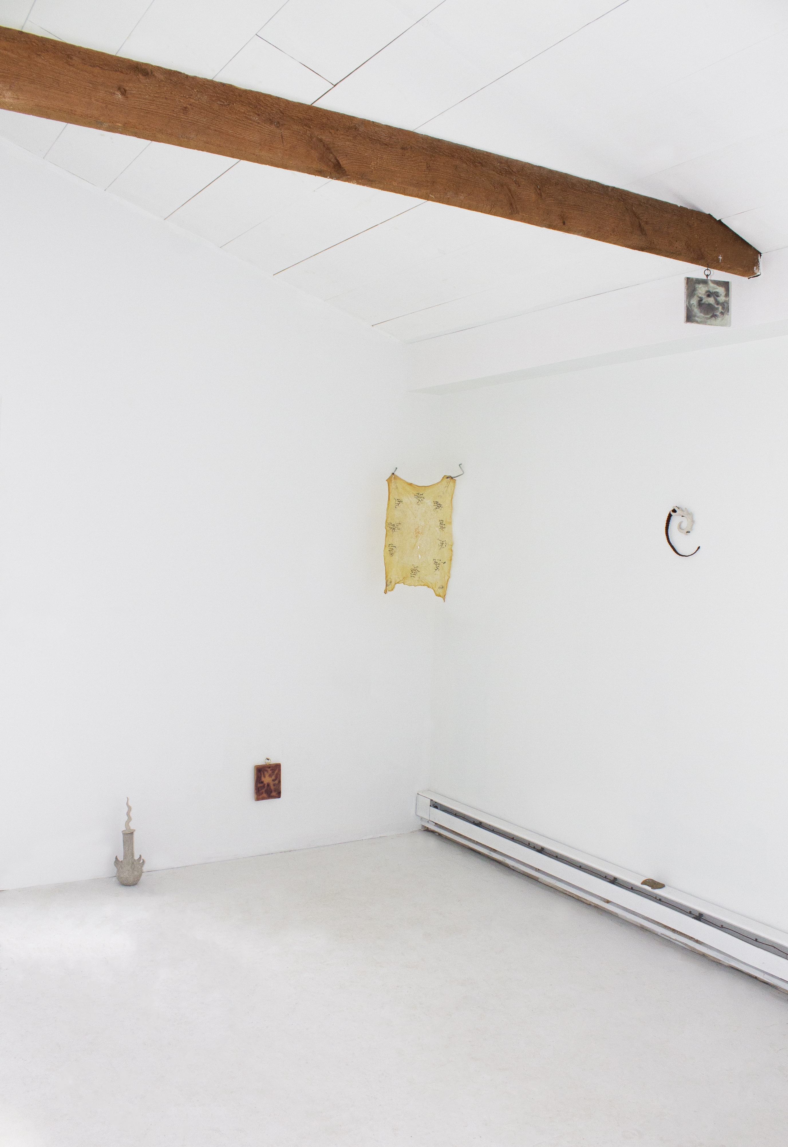 While Parant-Marquis’ surreal paintings invite the viewer into an abstract interior reminiscent of organs, plant life and caves; Sjӧlander combines elements found in nature (insects, vegetation) to tentacular ceramic objects that penetrate the space like stalagmites. éli del’s work is imbued in spiritual ritual: bioengineered skins and animal hides are tattooed with sigils and suspended, evoking the gut bacteria’s wisdom and celebrating the parasitic relationships intrinsic to nature. Finally, Patick-Dyck’s text based works act as altars, poems celebrating states of devotion, intoxication, grief and ecstasy. These are maximalist calls to the divine, that celebrate all over-pouring. Ink drips on fabric, images are collaged between flower petals, wine stains and dirt dye surfaces with urgency.