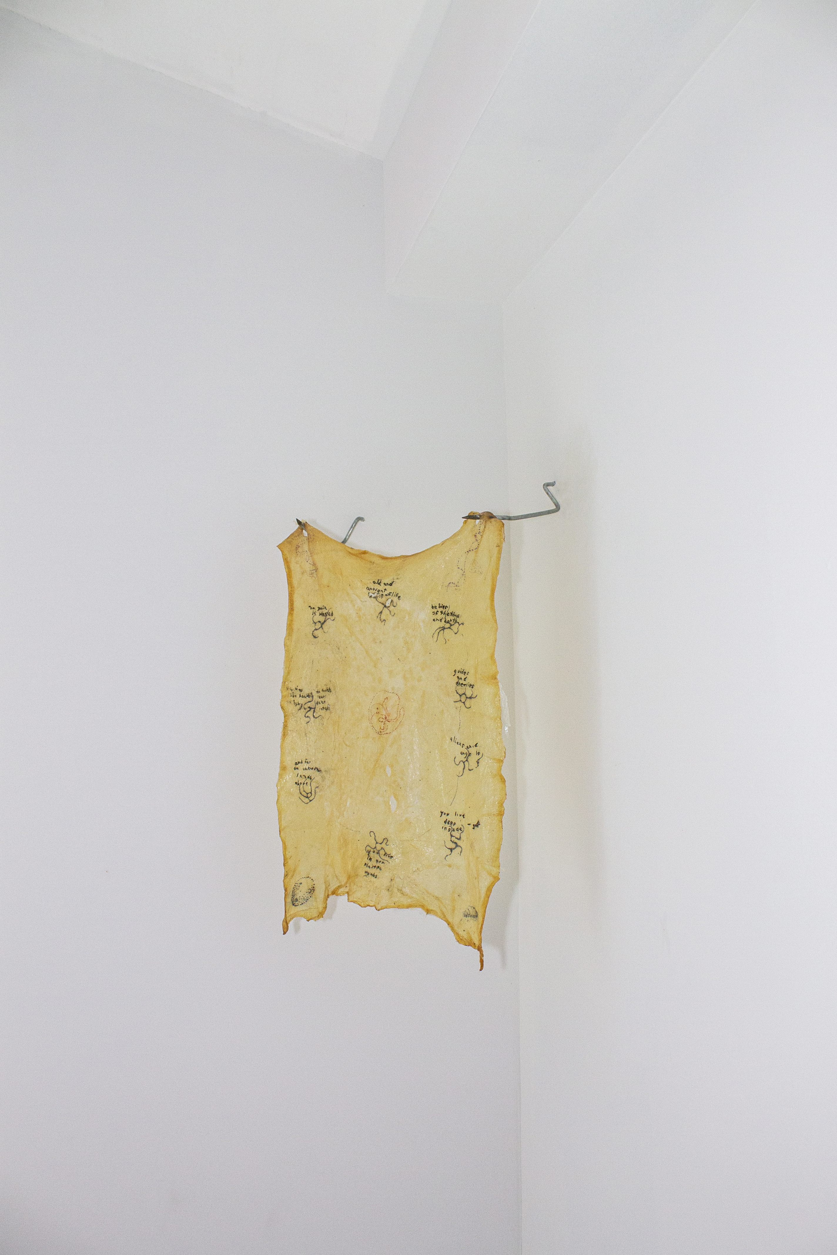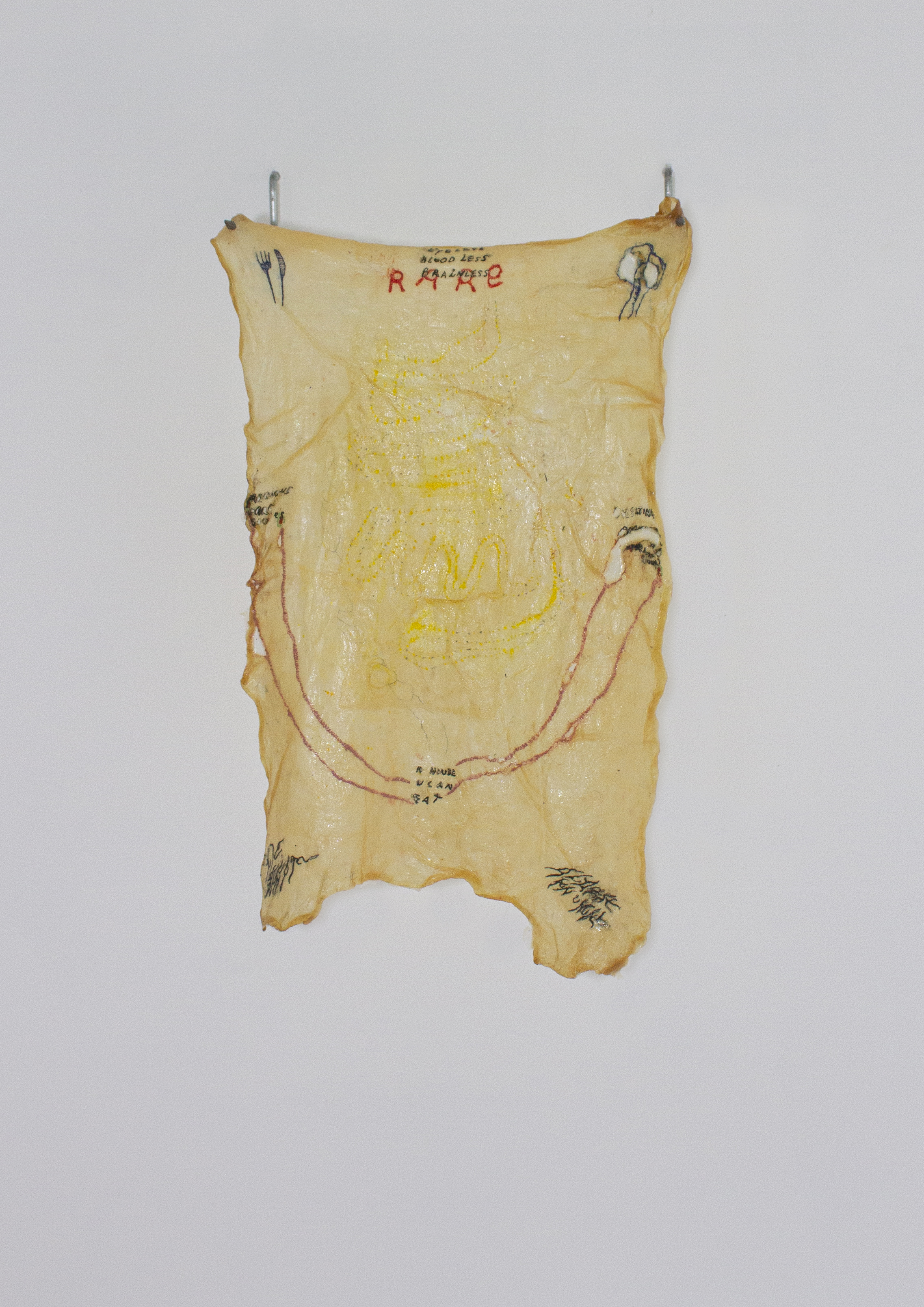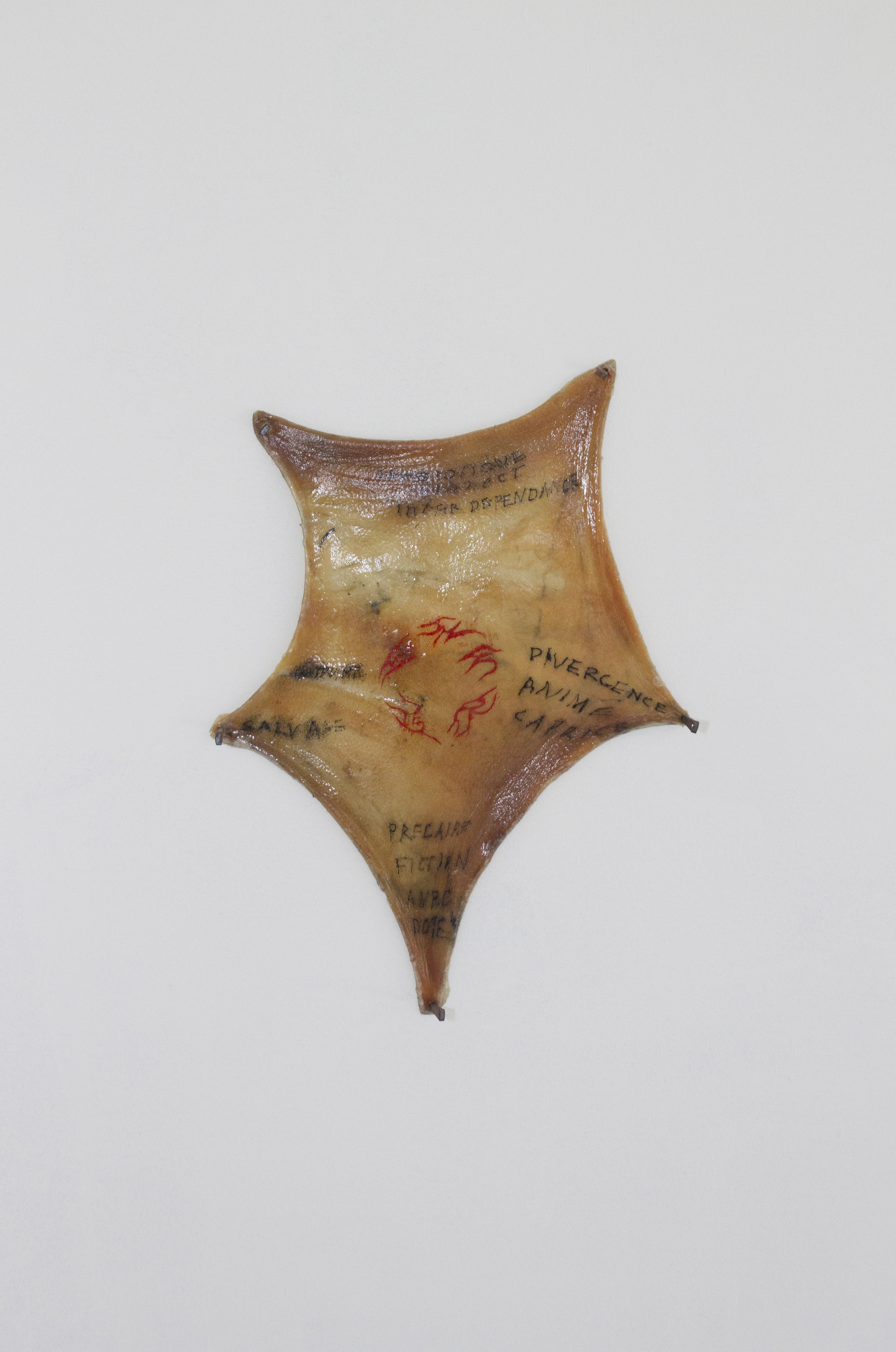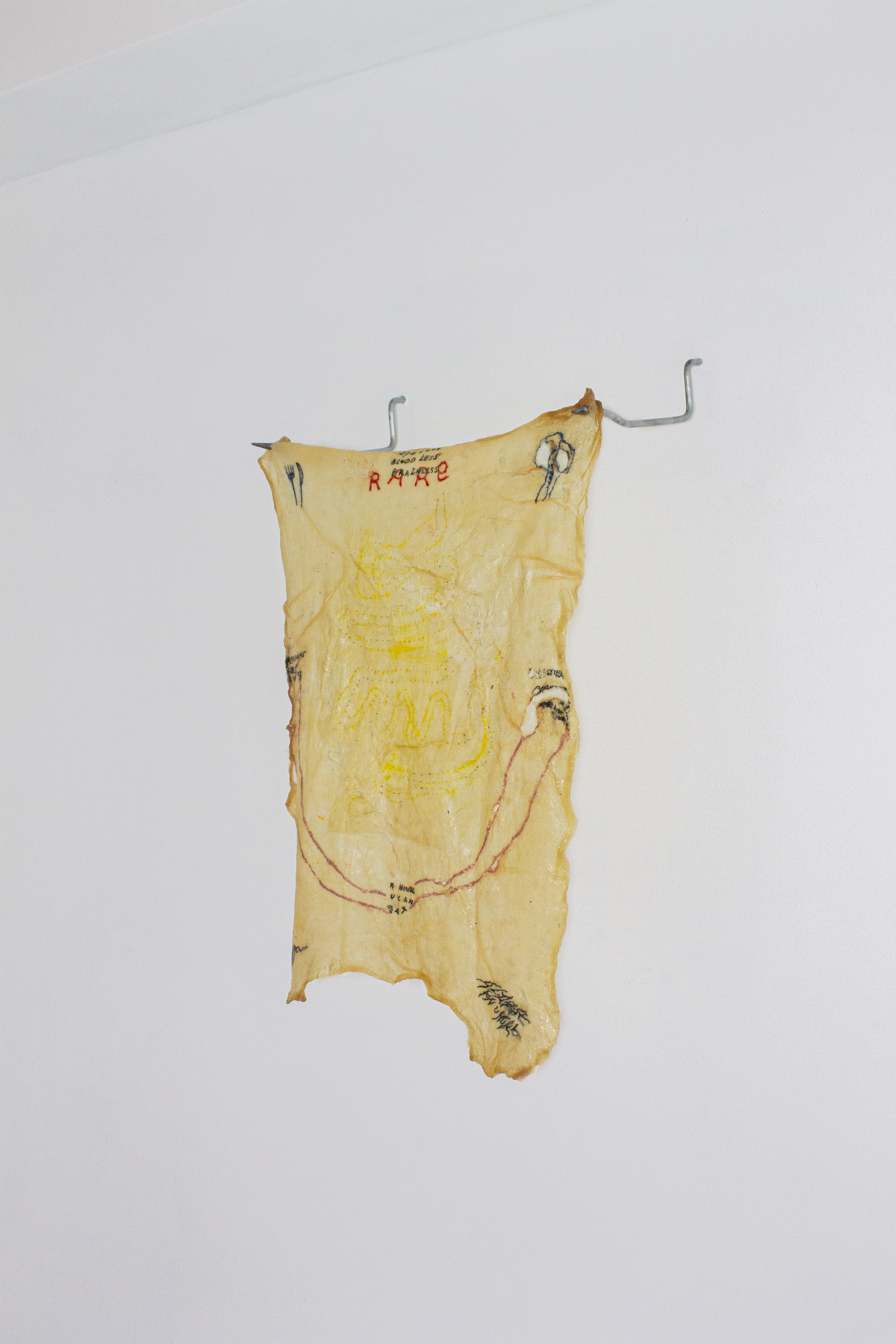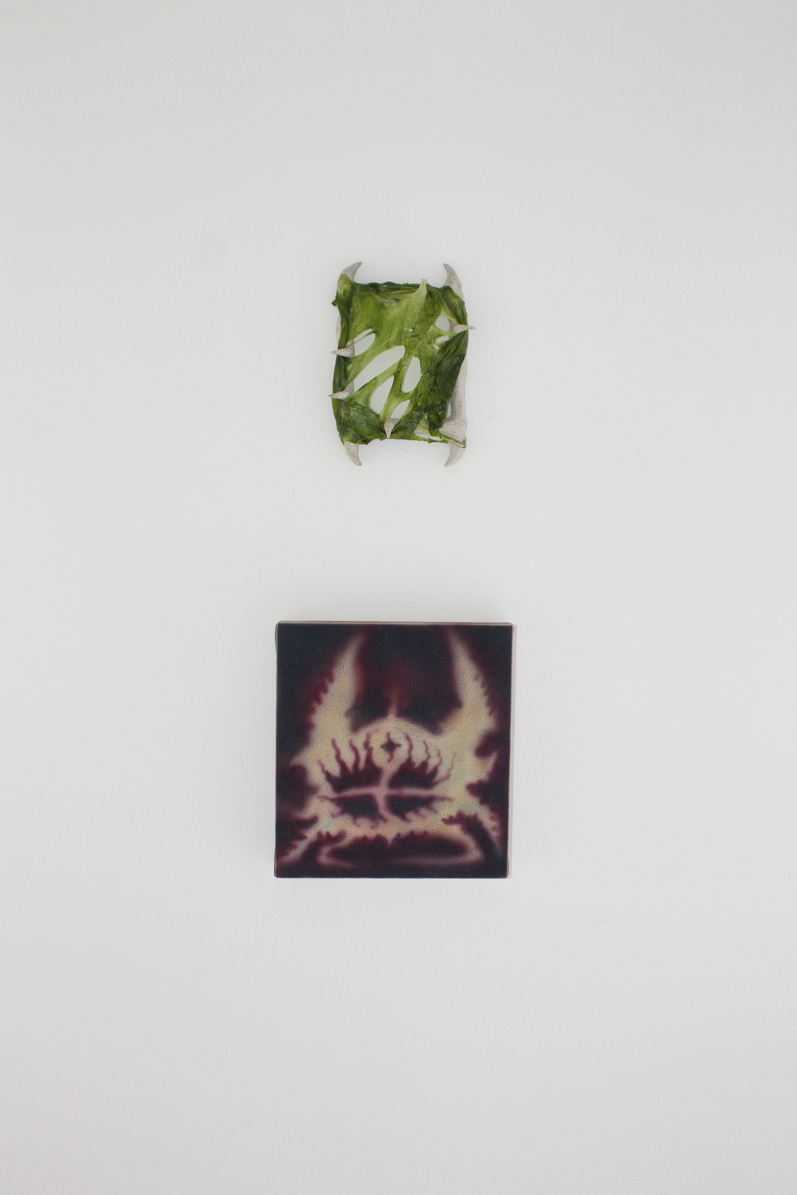 While Parant-Marquis’ surreal paintings invite the viewer into an abstract interior reminiscent of organs, plant life and caves; Sjӧlander combines elements found in nature (insects, vegetation) to tentacular ceramic objects that penetrate the space like stalagmites. éli del’s work is imbued in spiritual ritual: bioengineered skins and animal hides are tattooed with sigils and suspended, evoking the gut bacteria’s wisdom and celebrating the parasitic relationships intrinsic to nature. Finally, Patick-Dyck’s text based works act as altars, poems celebrating states of devotion, intoxication, grief and ecstasy. These are maximalist calls to the divine, that celebrate all over-pouring. Ink drips on fabric, images are collaged between flower petals, wine stains and dirt dye surfaces with urgency.