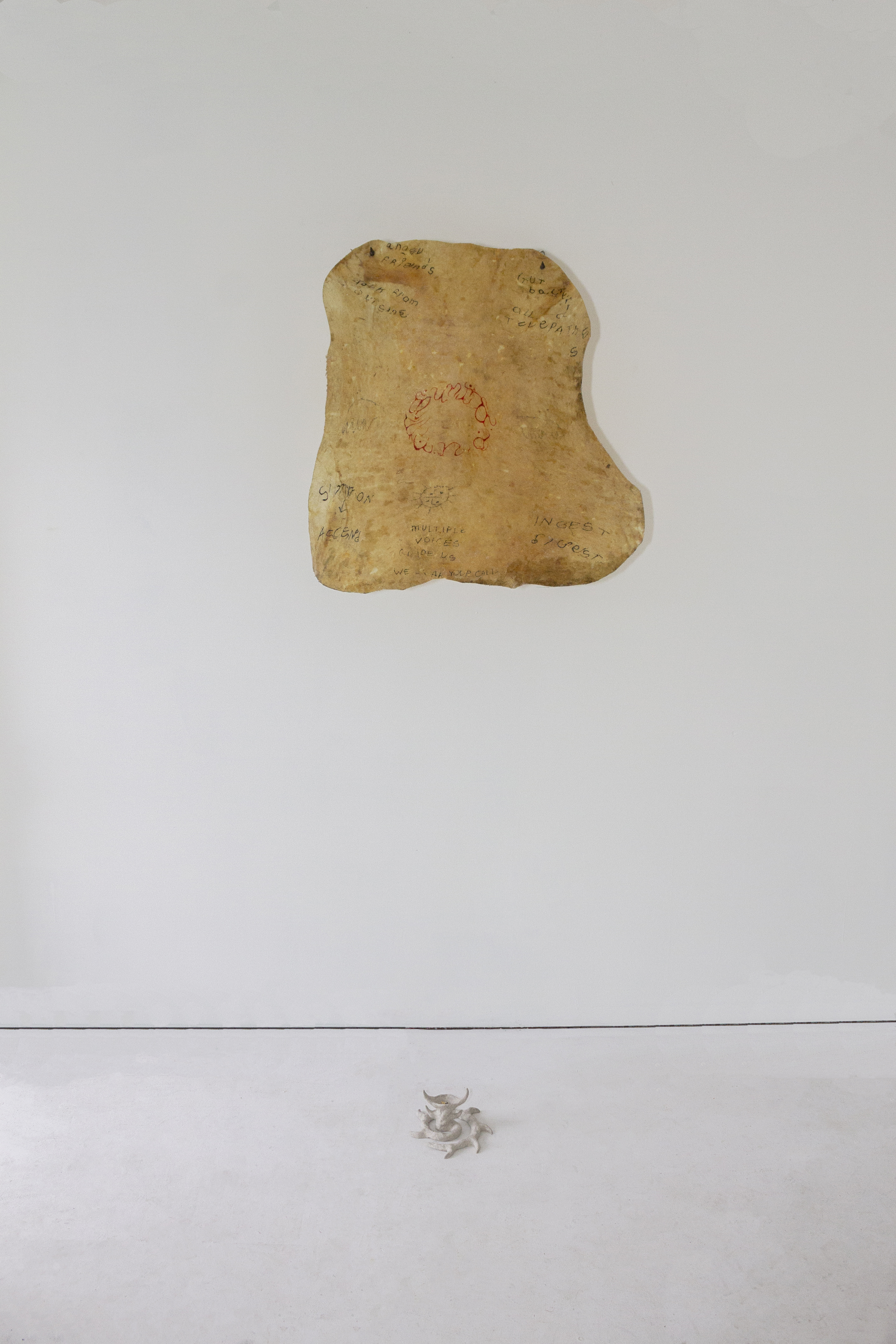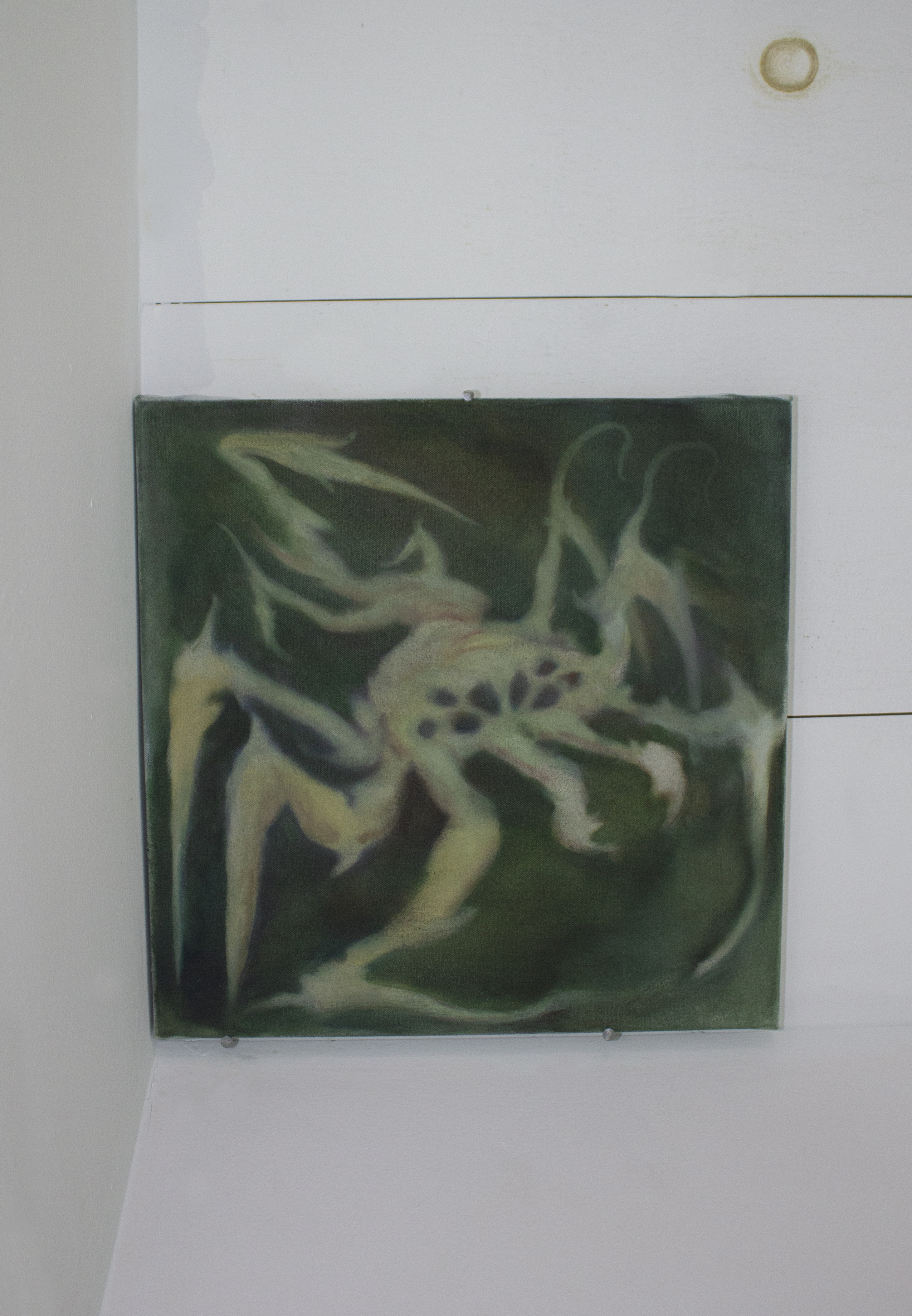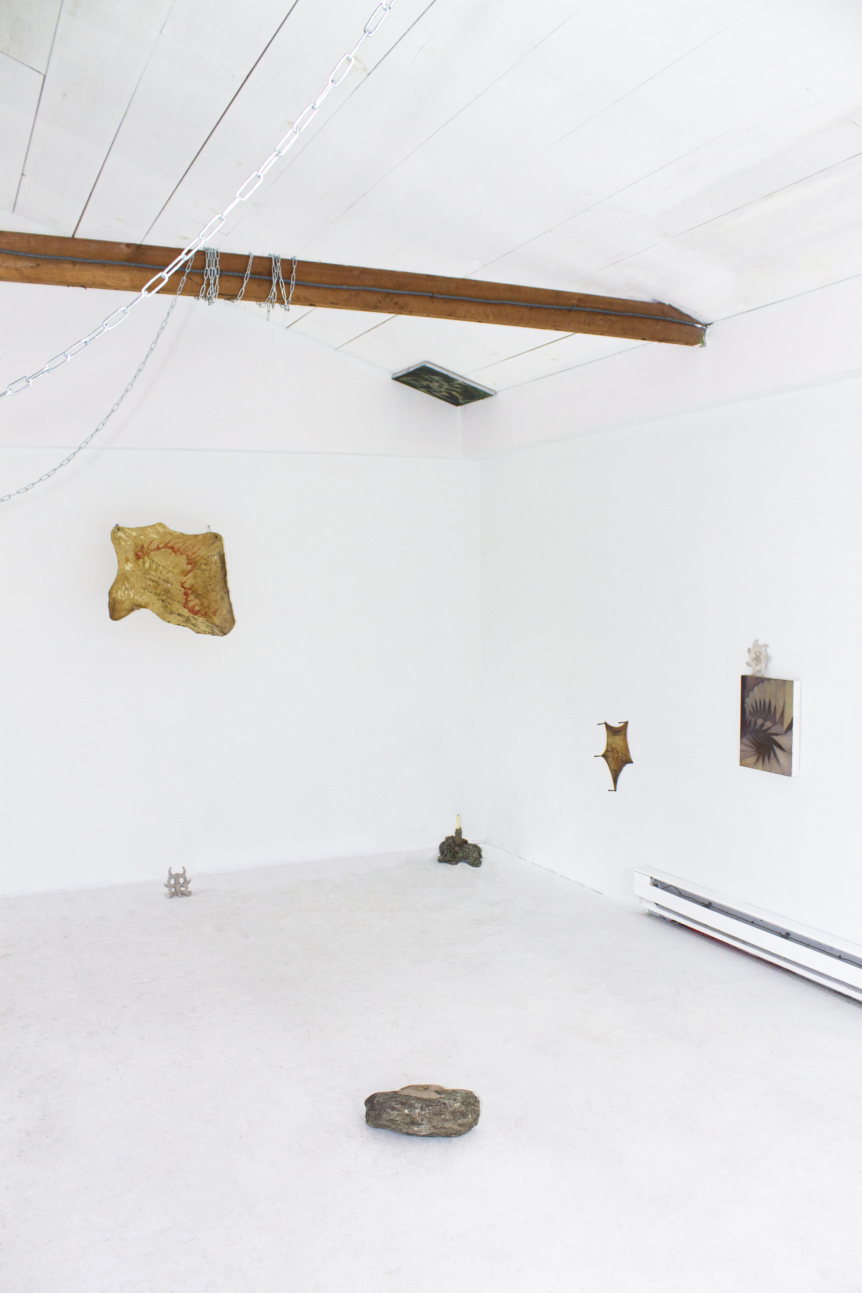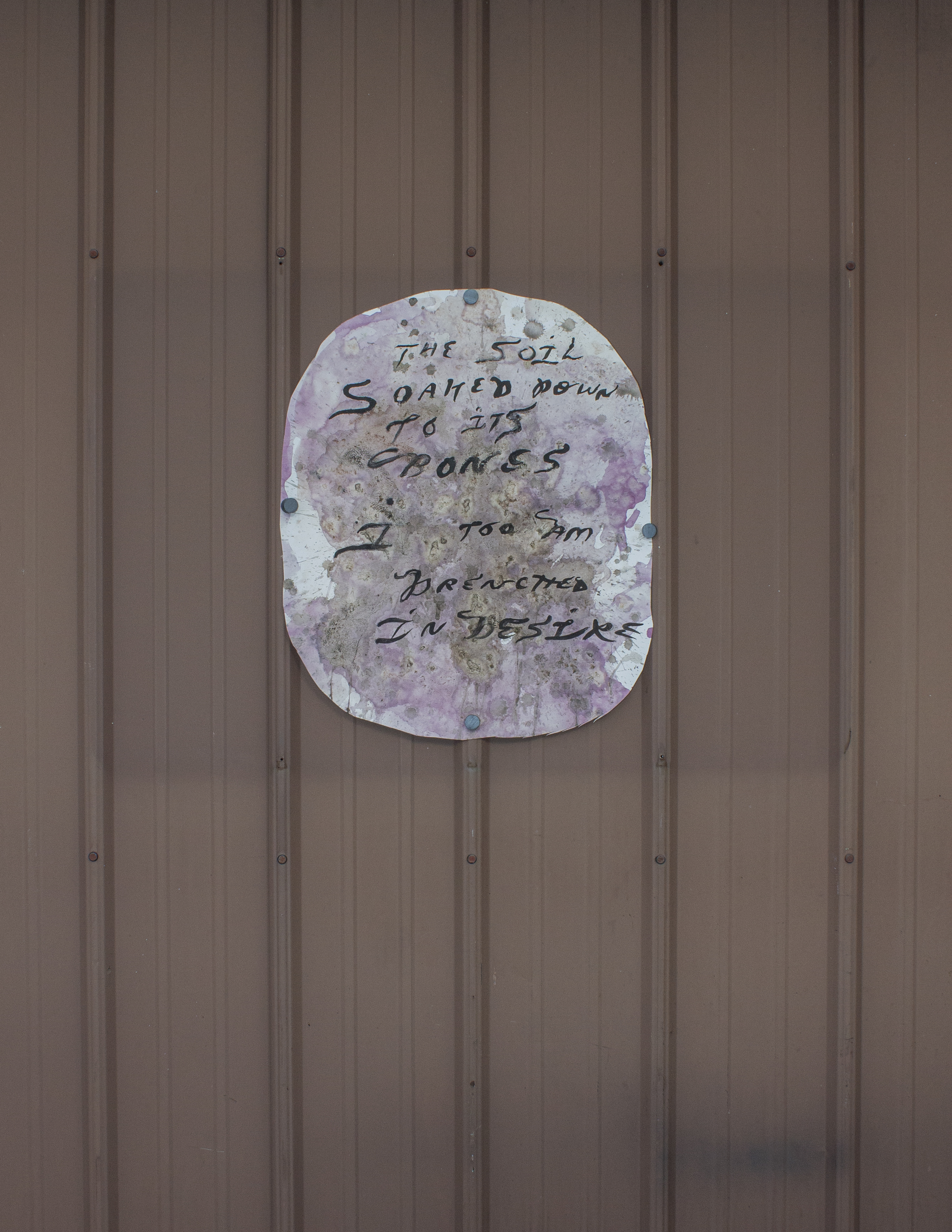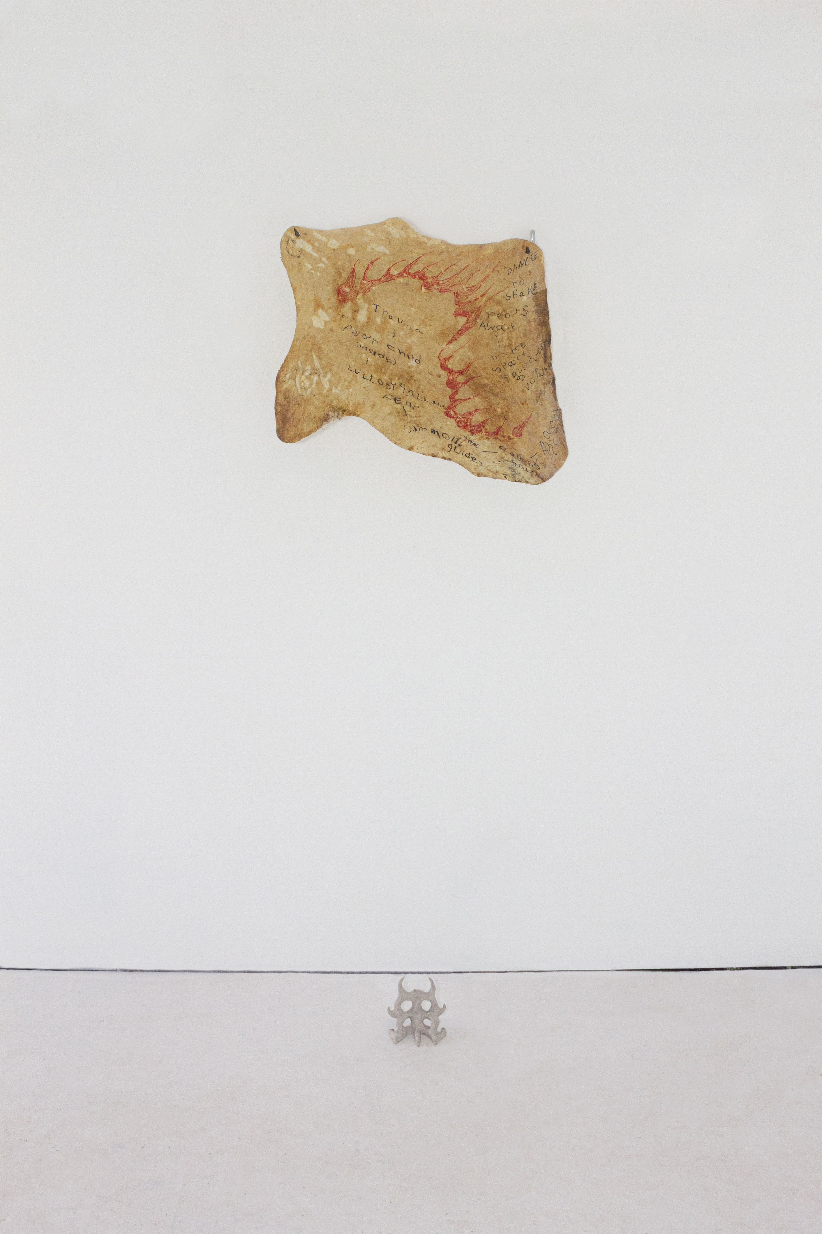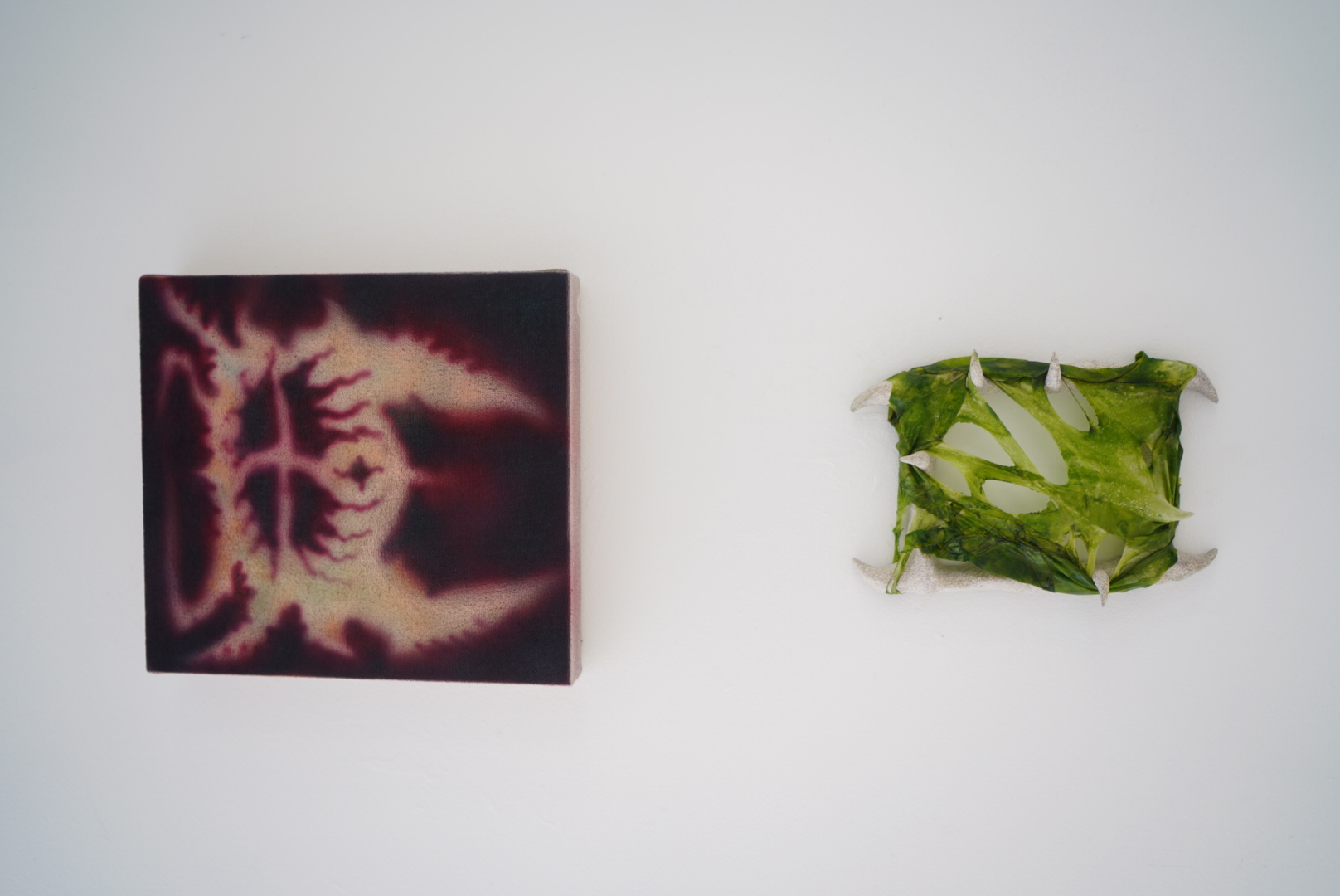 While Parant-Marquis’ surreal paintings invite the viewer into an abstract interior reminiscent of organs, plant life and caves; Sjӧlander combines elements found in nature (insects, vegetation) to tentacular ceramic objects that penetrate the space like stalagmites. éli del’s work is imbued in spiritual ritual: bioengineered skins and animal hides are tattooed with sigils and suspended, evoking the gut bacteria’s wisdom and celebrating the parasitic relationships intrinsic to nature. Finally, Patick-Dyck’s text based works act as altars, poems celebrating states of devotion, intoxication, grief and ecstasy. These are maximalist calls to the divine, that celebrate all over-pouring. Ink drips on fabric, images are collaged between flower petals, wine stains and dirt dye surfaces with urgency.