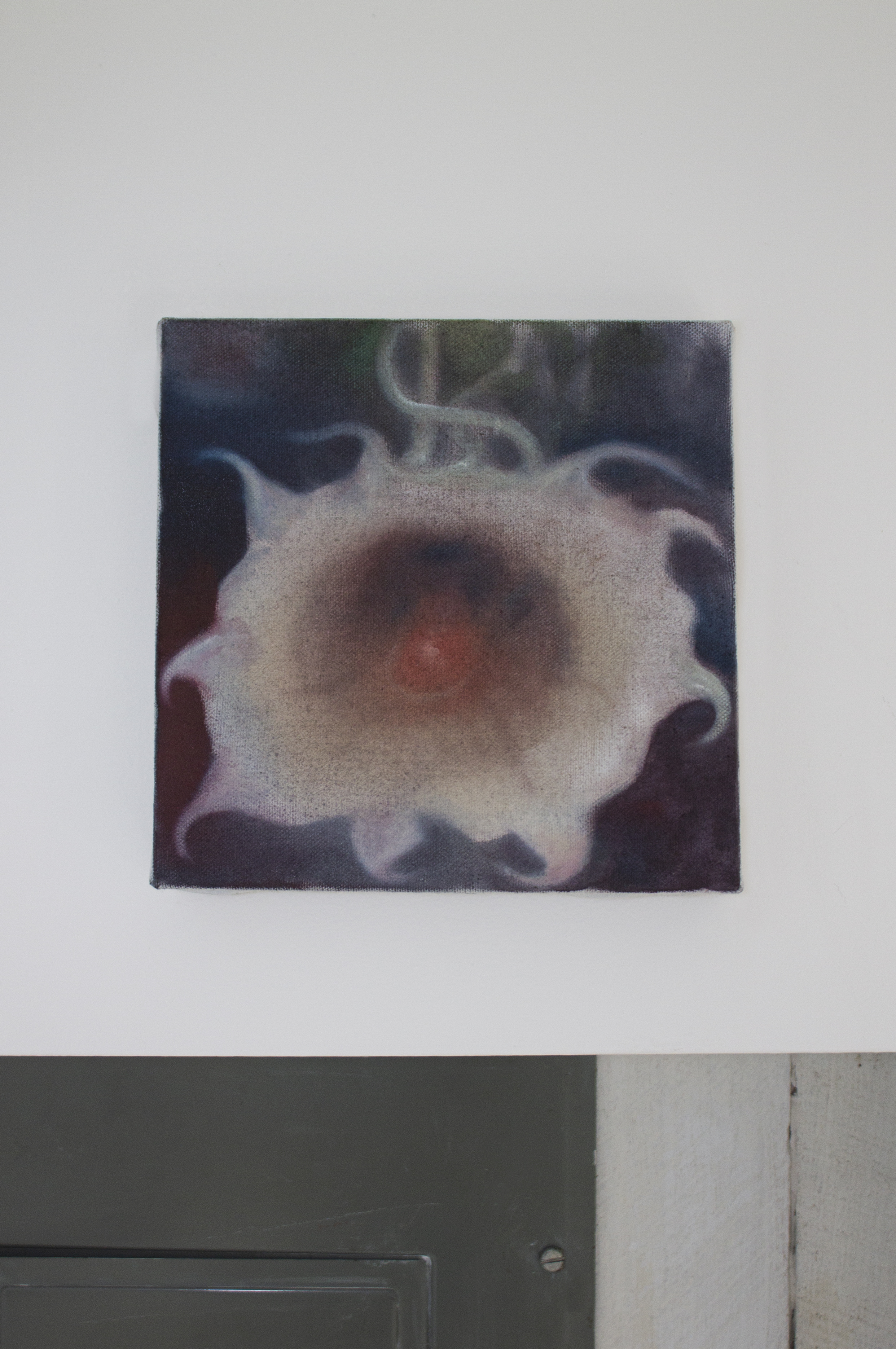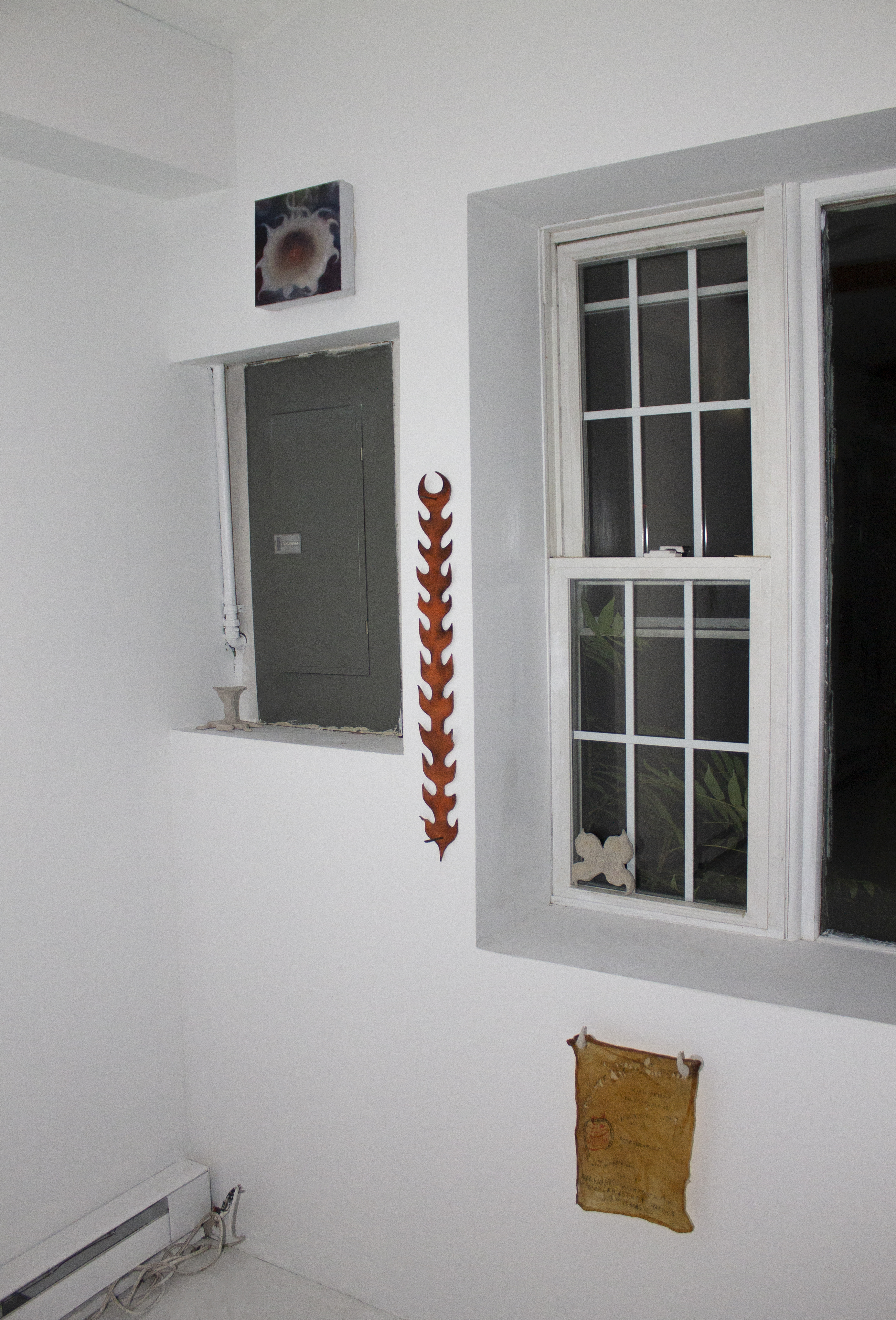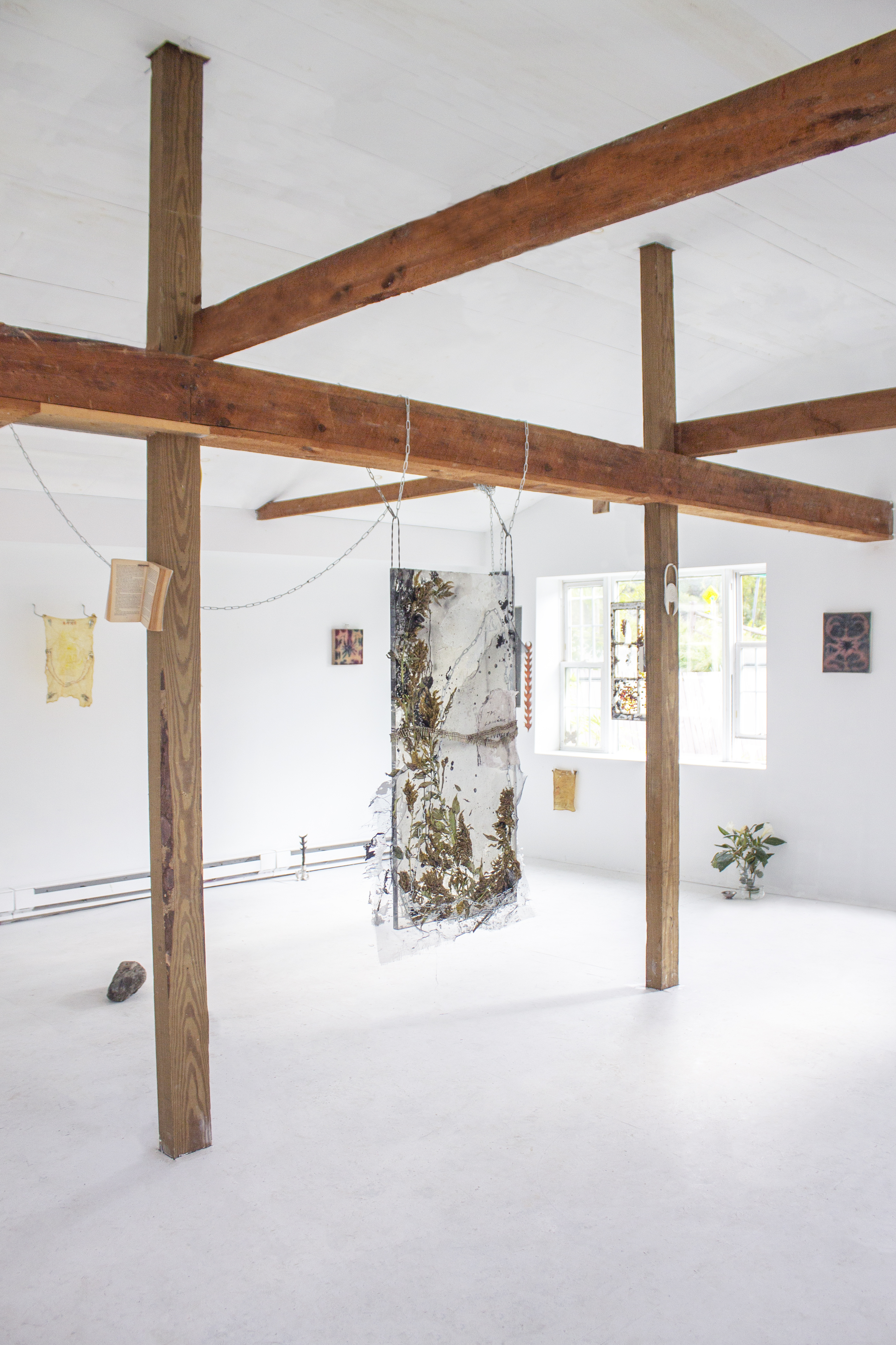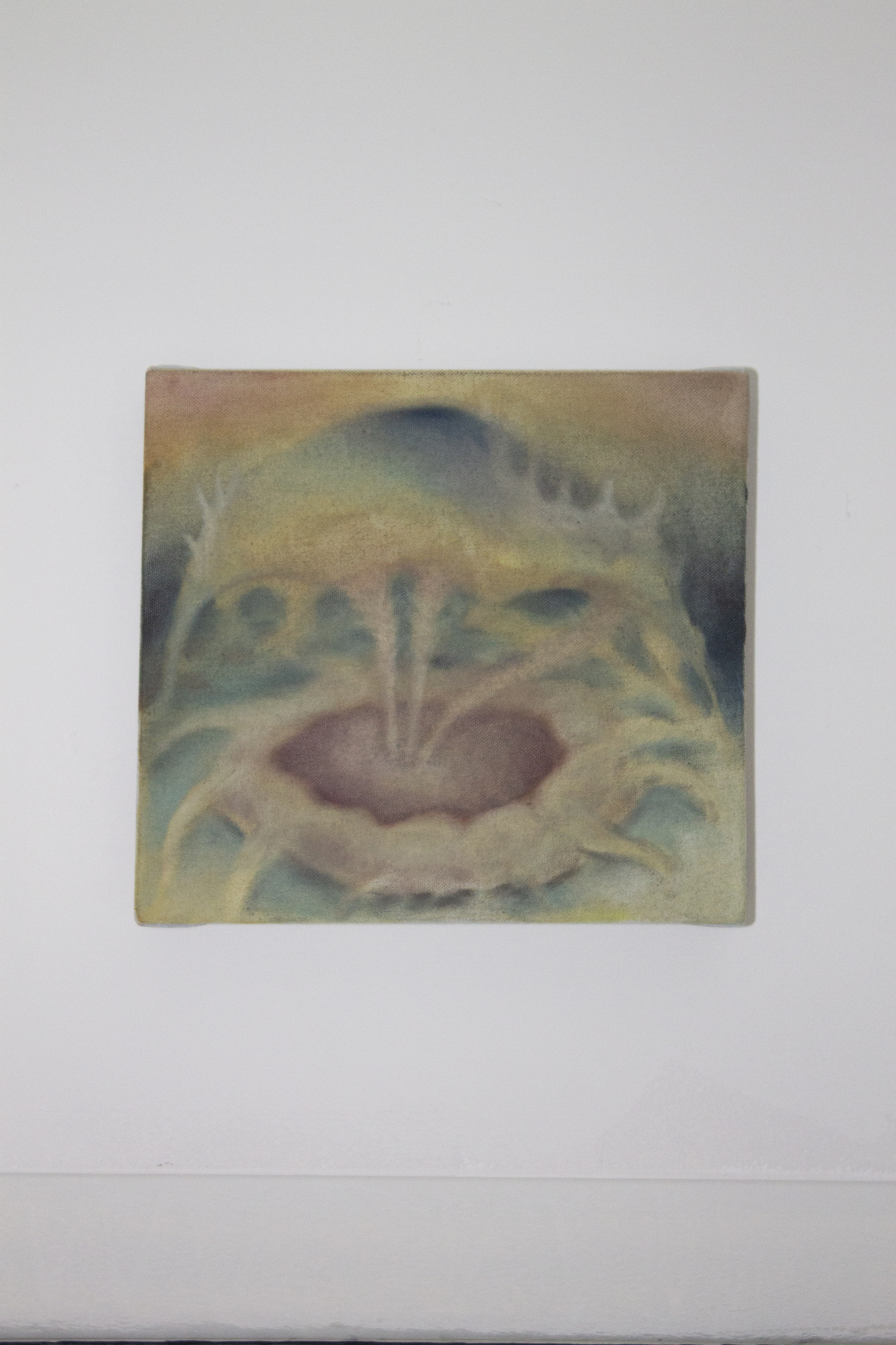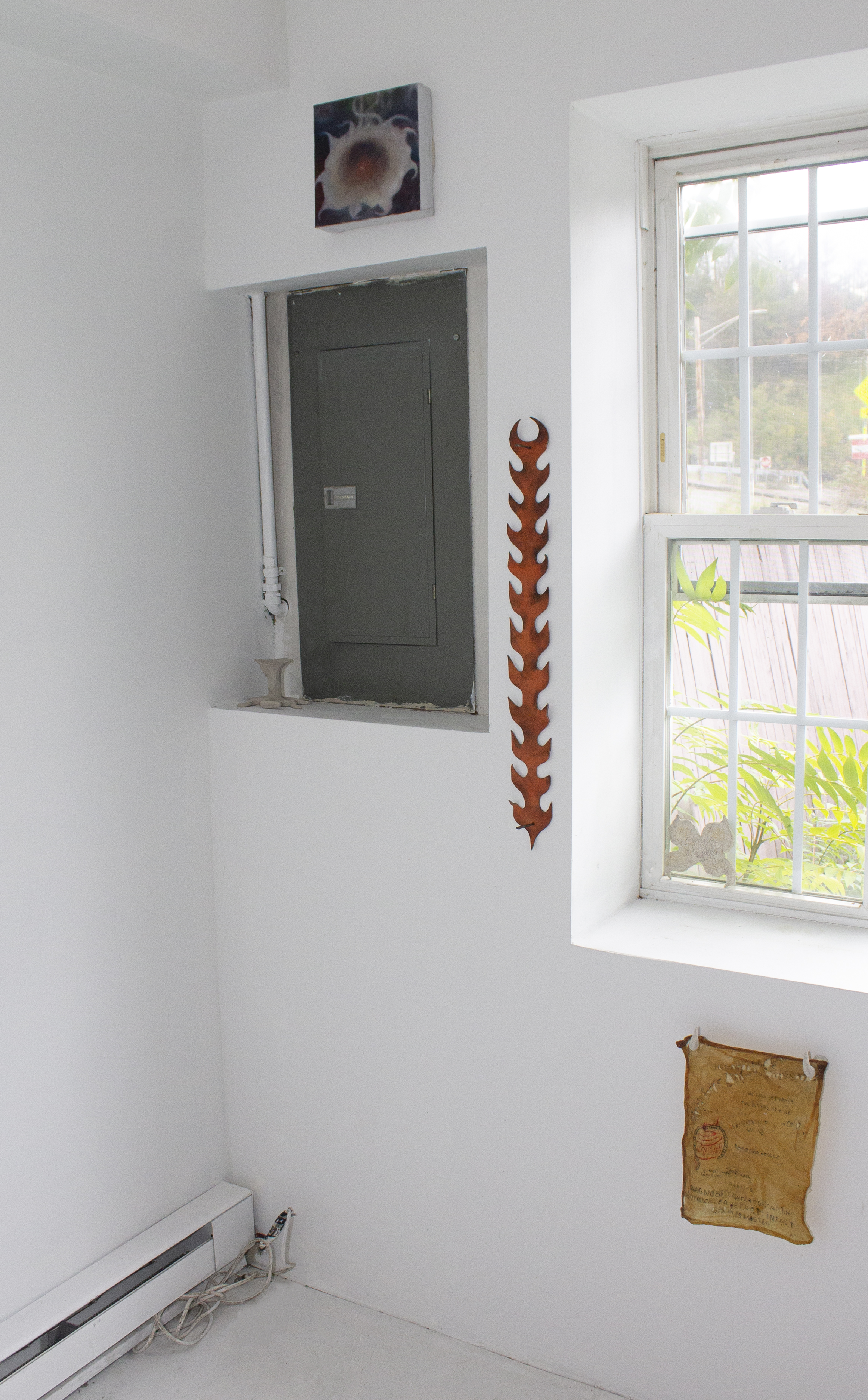 While Parant-Marquis’ surreal paintings invite the viewer into an abstract interior reminiscent of organs, plant life and caves; Sjӧlander combines elements found in nature (insects, vegetation) to tentacular ceramic objects that penetrate the space like stalagmites. éli del’s work is imbued in spiritual ritual: bioengineered skins and animal hides are tattooed with sigils and suspended, evoking the gut bacteria’s wisdom and celebrating the parasitic relationships intrinsic to nature. Finally, Patick-Dyck’s text based works act as altars, poems celebrating states of devotion, intoxication, grief and ecstasy. These are maximalist calls to the divine, that celebrate all over-pouring. Ink drips on fabric, images are collaged between flower petals, wine stains and dirt dye surfaces with urgency.