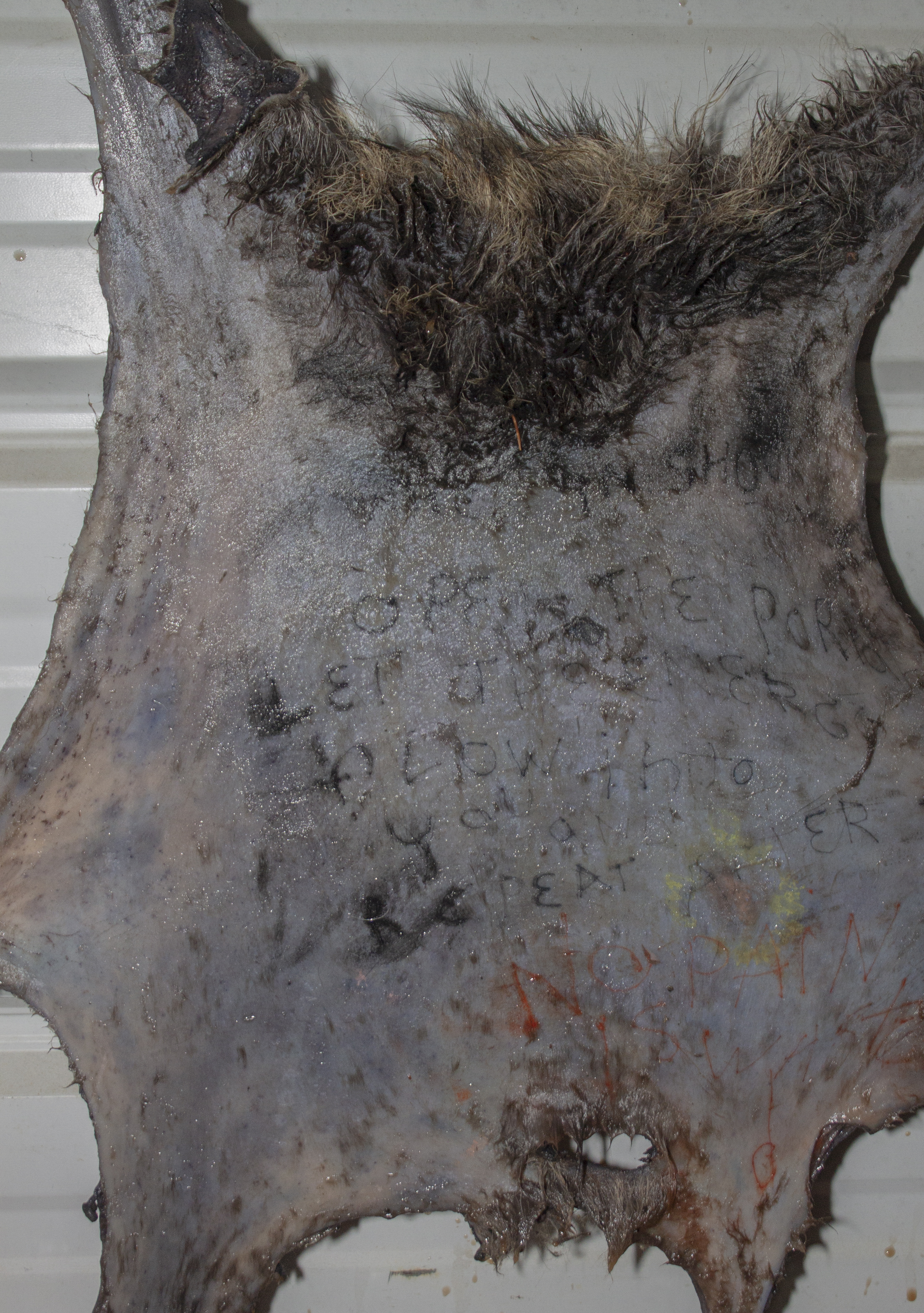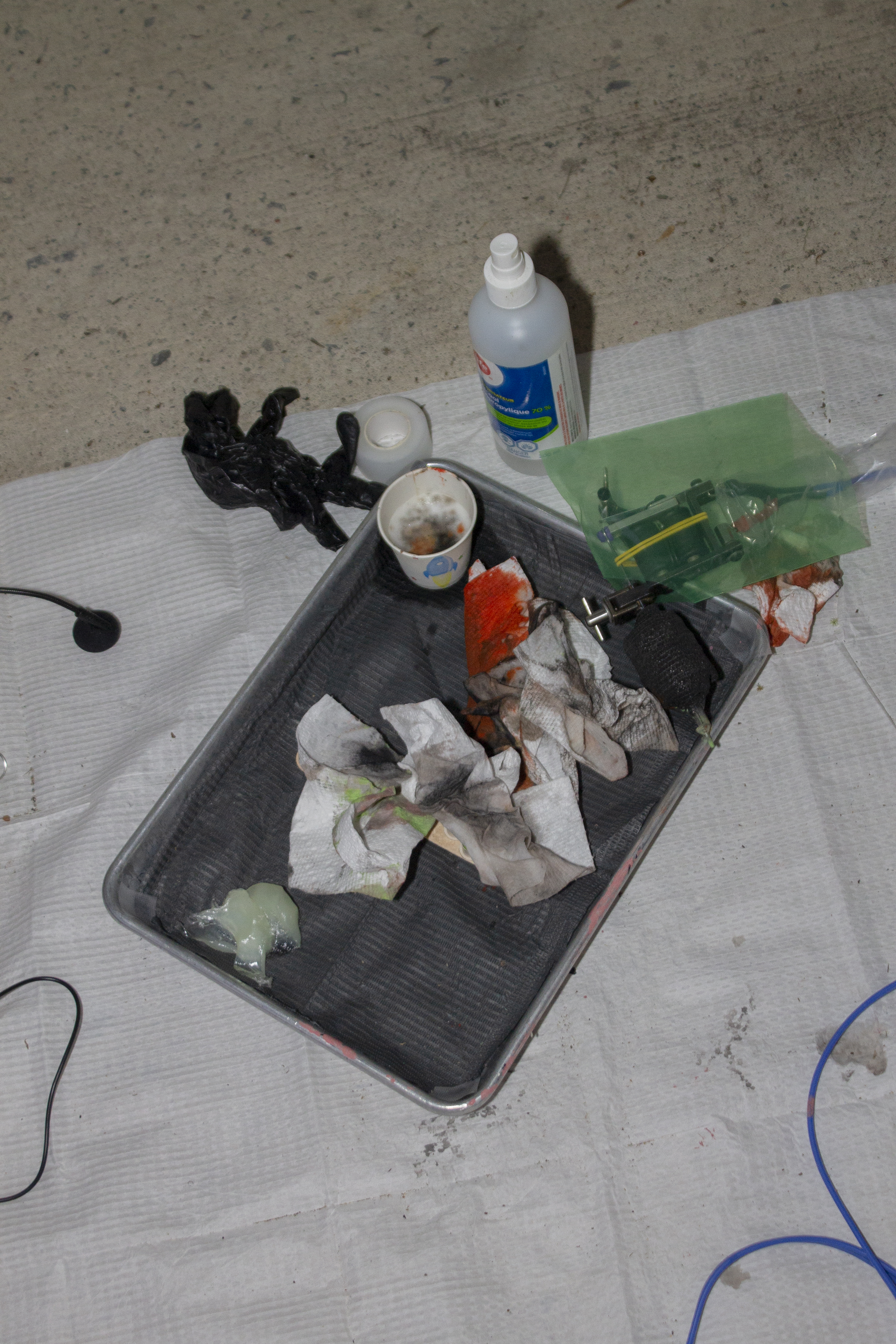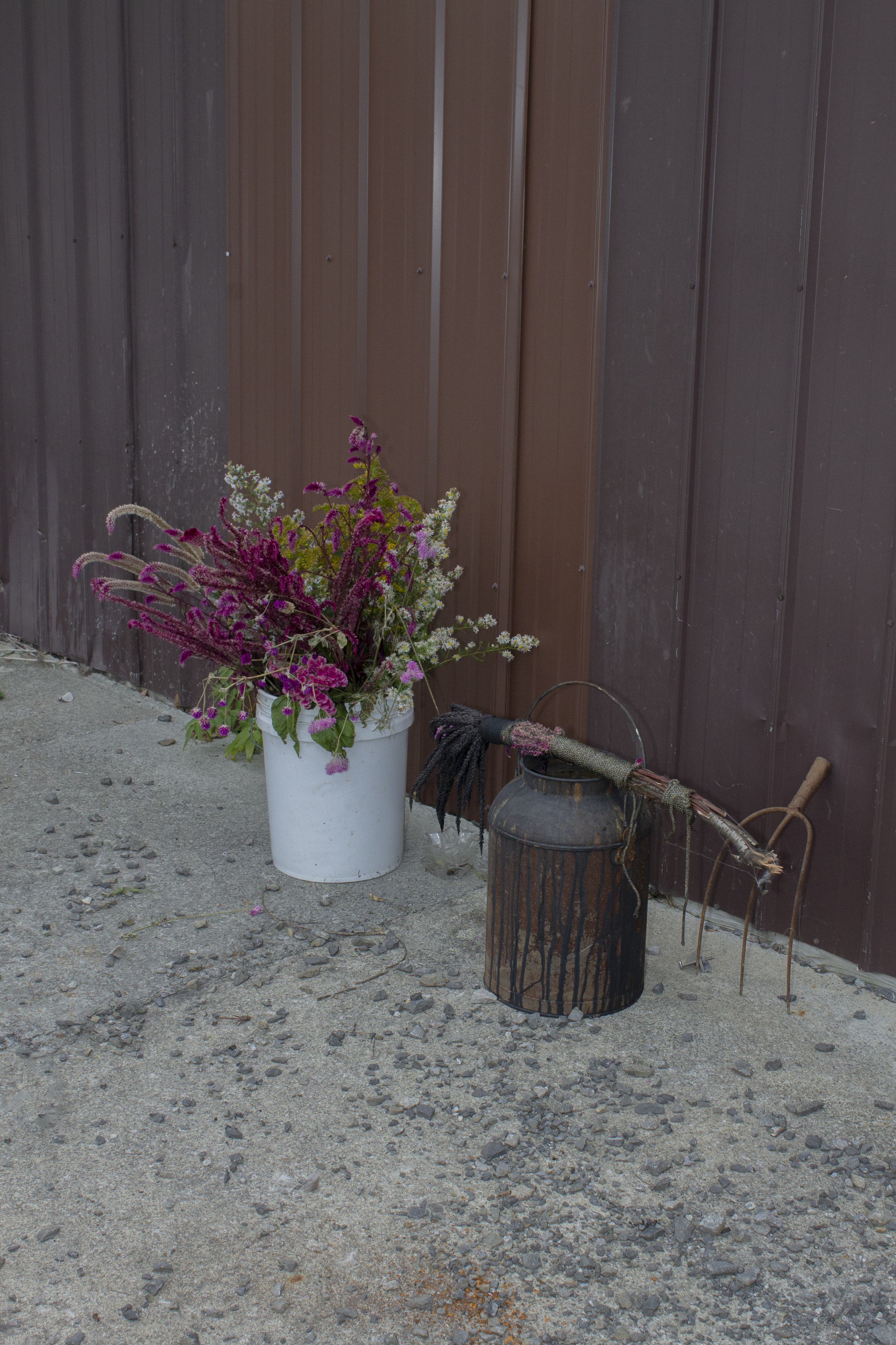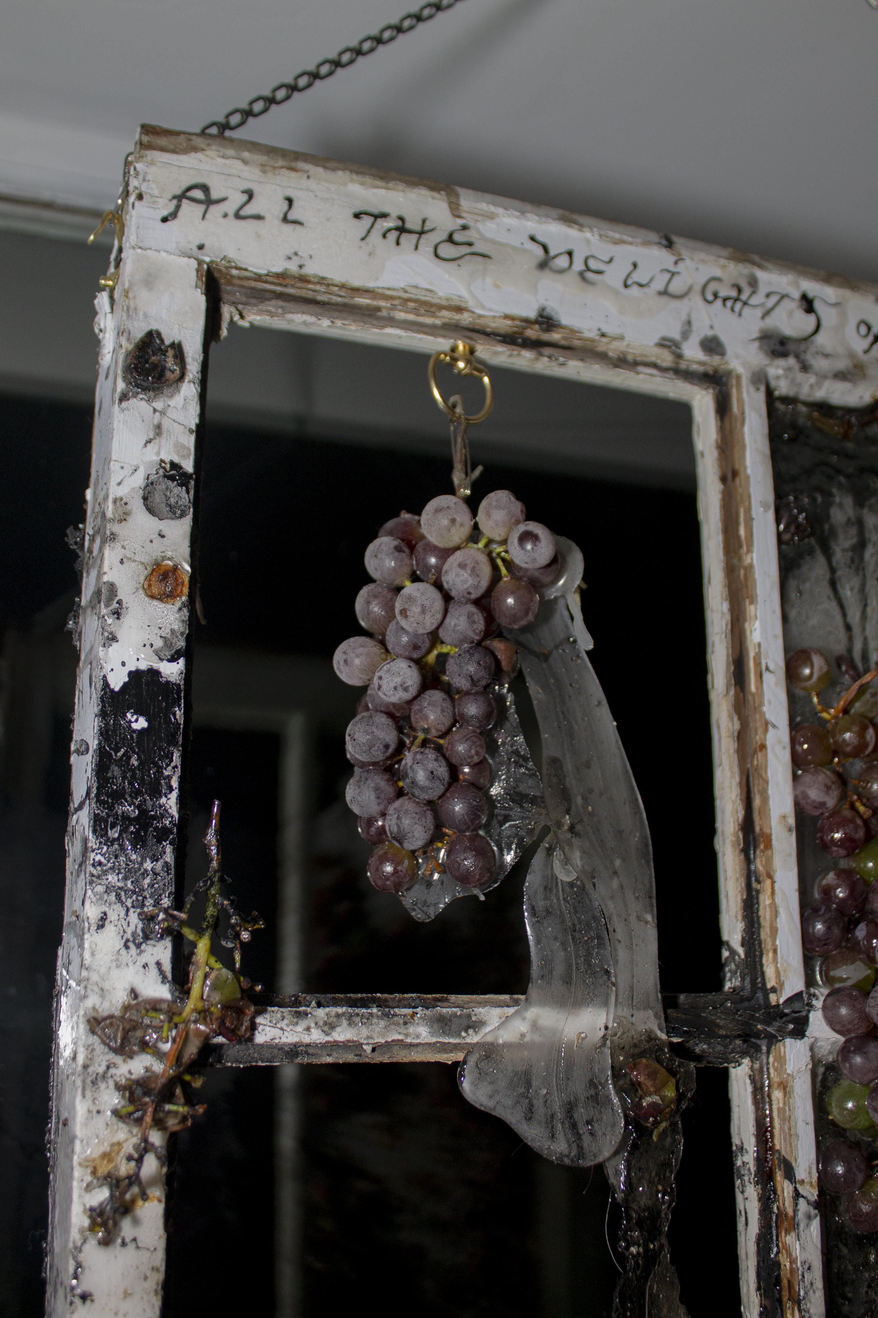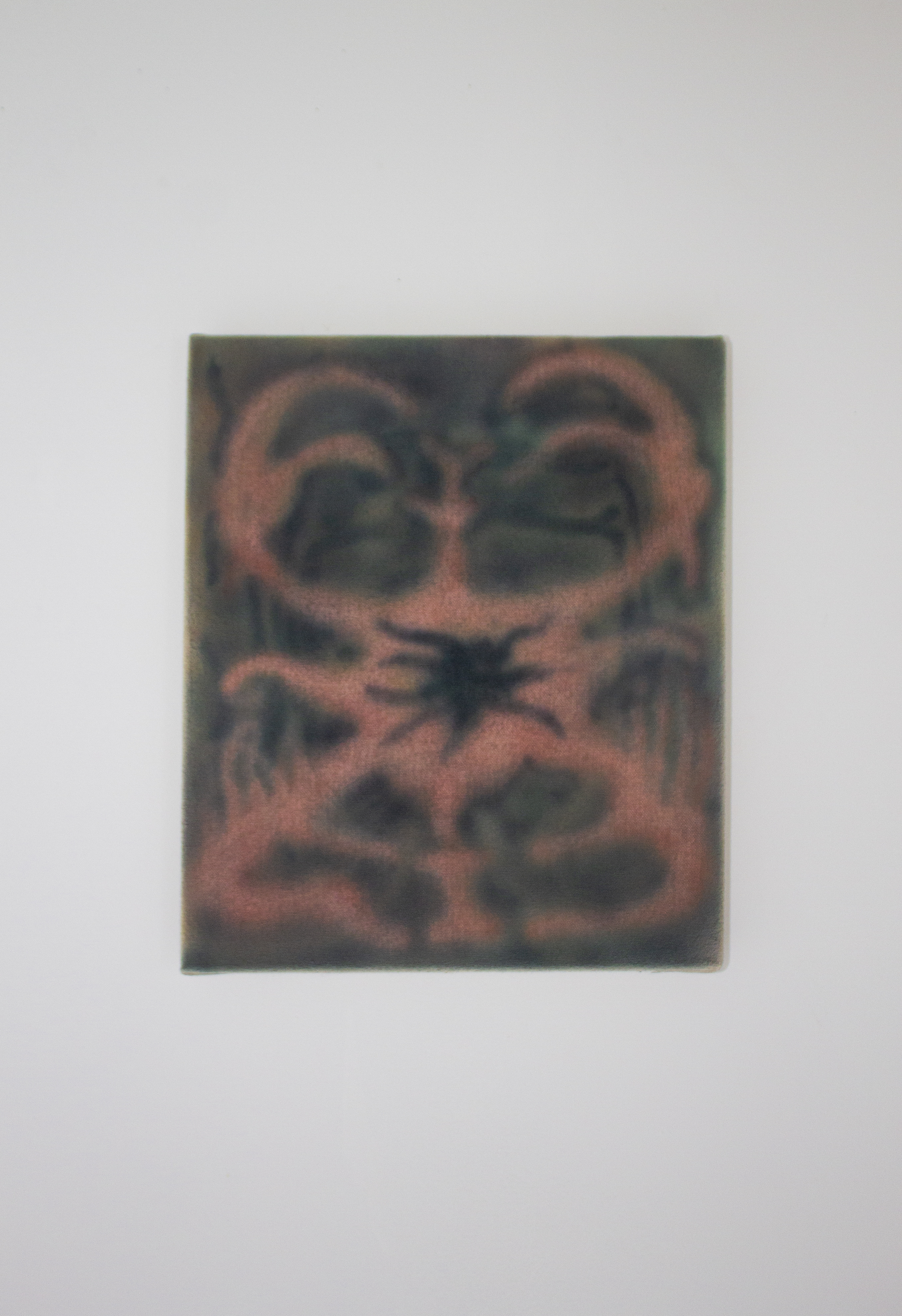 While Parant-Marquis’ surreal paintings invite the viewer into an abstract interior reminiscent of organs, plant life and caves; Sjӧlander combines elements found in nature (insects, vegetation) to tentacular ceramic objects that penetrate the space like stalagmites. éli del’s work is imbued in spiritual ritual: bioengineered skins and animal hides are tattooed with sigils and suspended, evoking the gut bacteria’s wisdom and celebrating the parasitic relationships intrinsic to nature. Finally, Patick-Dyck’s text based works act as altars, poems celebrating states of devotion, intoxication, grief and ecstasy. These are maximalist calls to the divine, that celebrate all over-pouring. Ink drips on fabric, images are collaged between flower petals, wine stains and dirt dye surfaces with urgency.