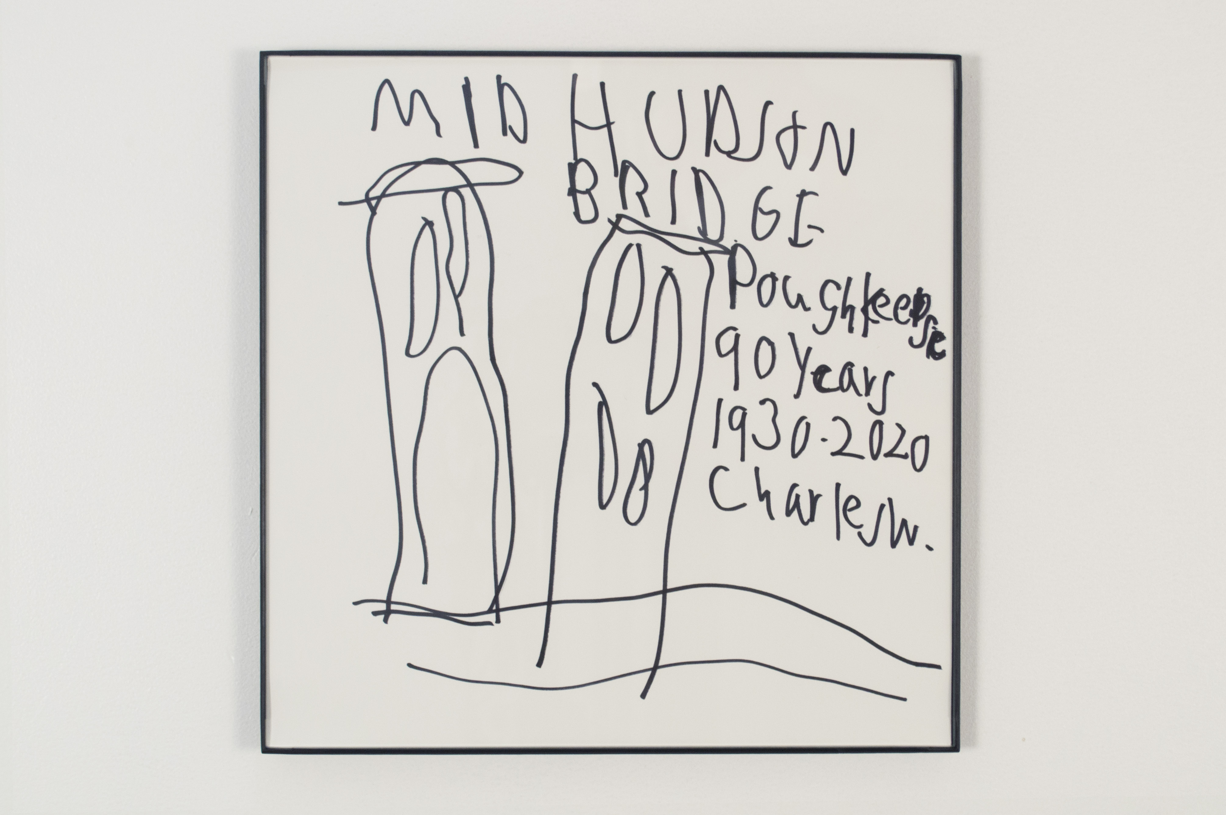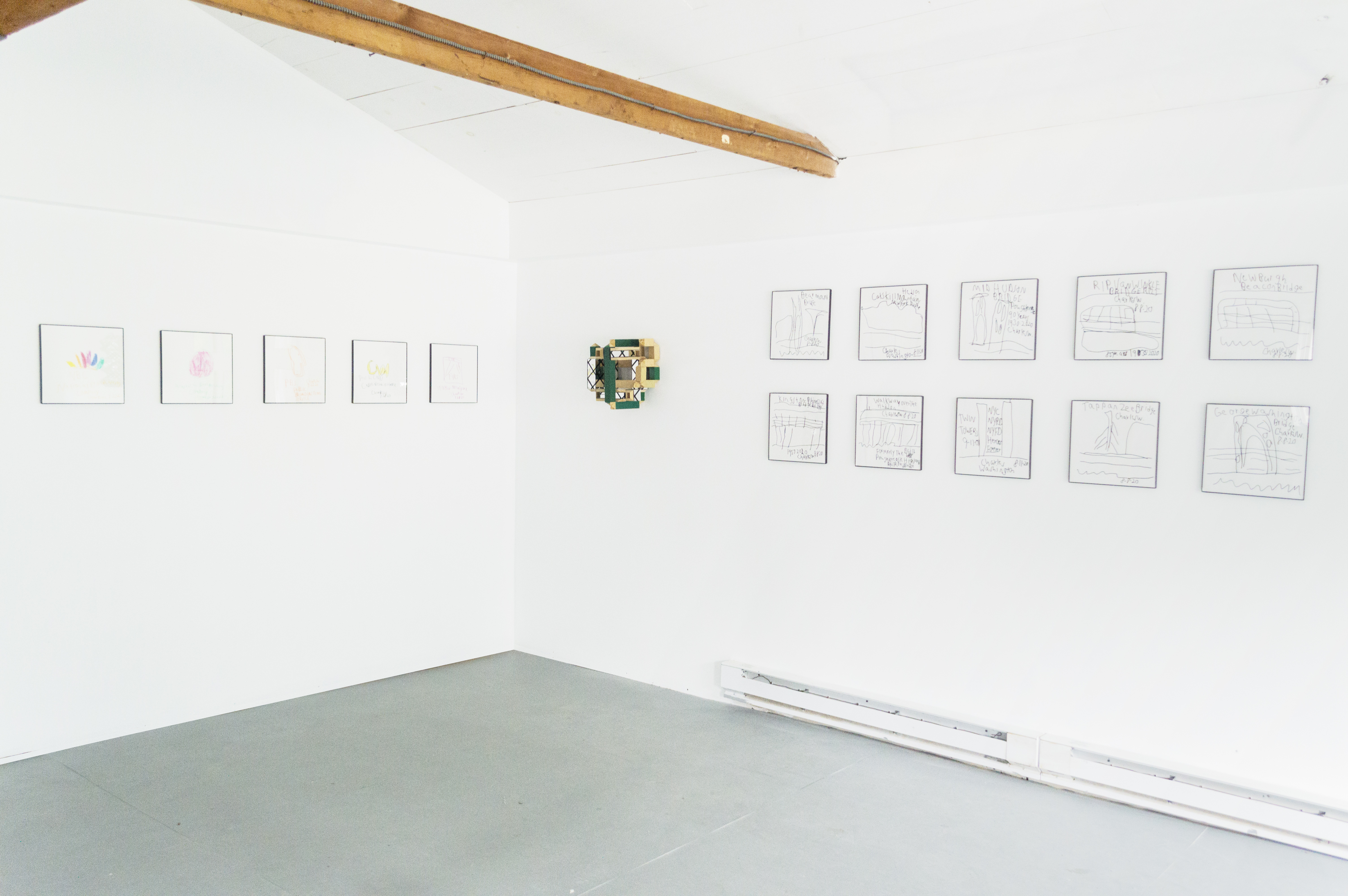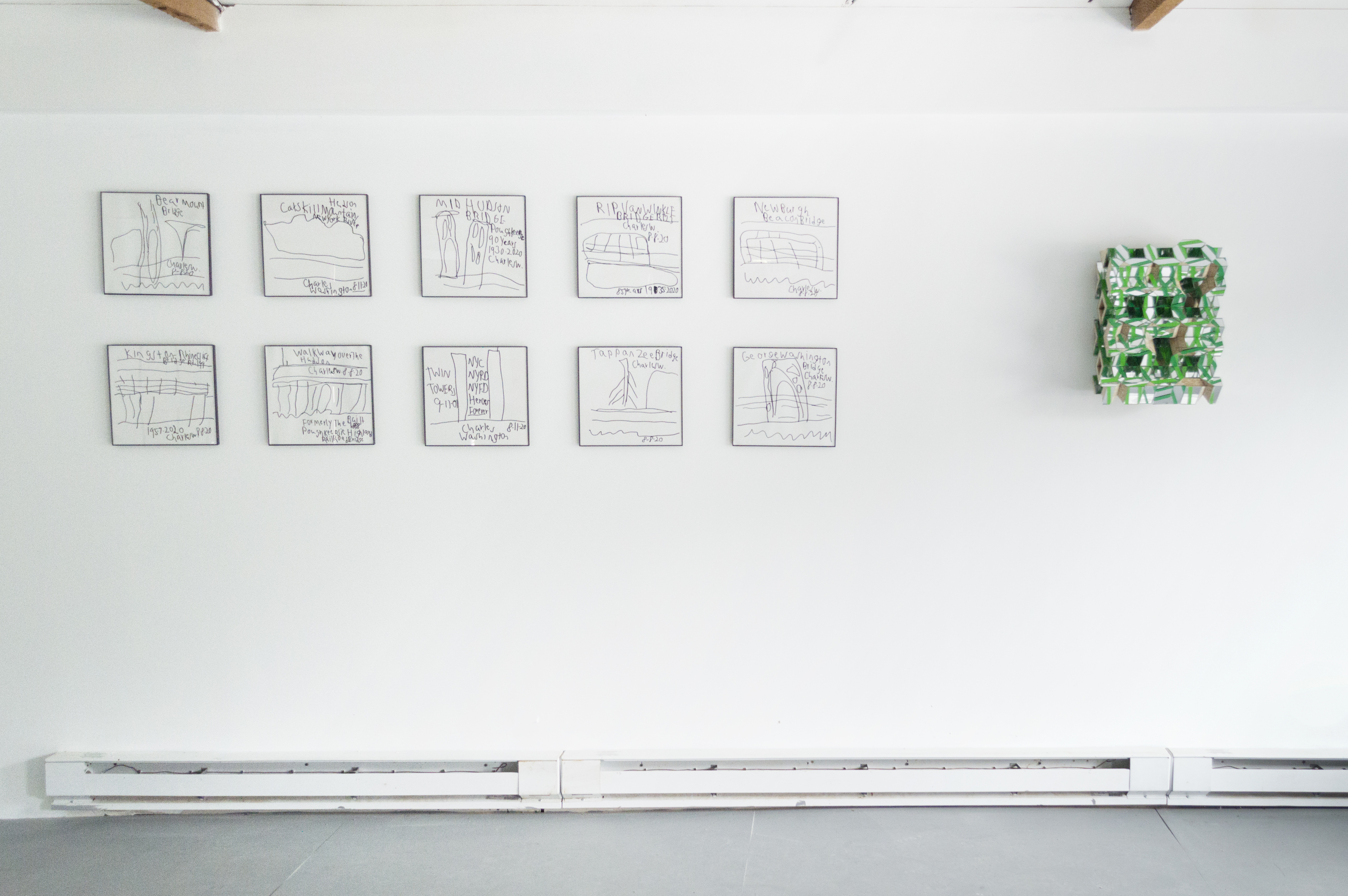 Charles is well known in Hudson for his drawings. Characterized by his interest in contemporary media and by his unmistakable sense of humor, his drawings have a linguistic quality and can be read as well as seen. Occasionally a portraitist, he usually works within a theme, quickly building exhaustive bodies of work on a given topic. This show includes a new group of drawings in ink on paper of Bridges in New York, including the Rip Van-Winkle Bridge, which connects Columbia County with Greene County, with one drawing in this series commemorating the Twin Towers. Charles is also showing a series in one of his signature themes - entertainment logos. These logos, though only seen briefly before a film or TV show, are familiar. We see these liminal images in the moments before a program begins, usually accompanied by a sound logo. Here, in a Warholian maneuver (it's worth mentioning that Charles is a DJ,) Charles samples the logo making it the focus of his work, shifting our attention from the content of the film or TV show to what the second artist in this show, Charlie Smith, calls the "envelope."