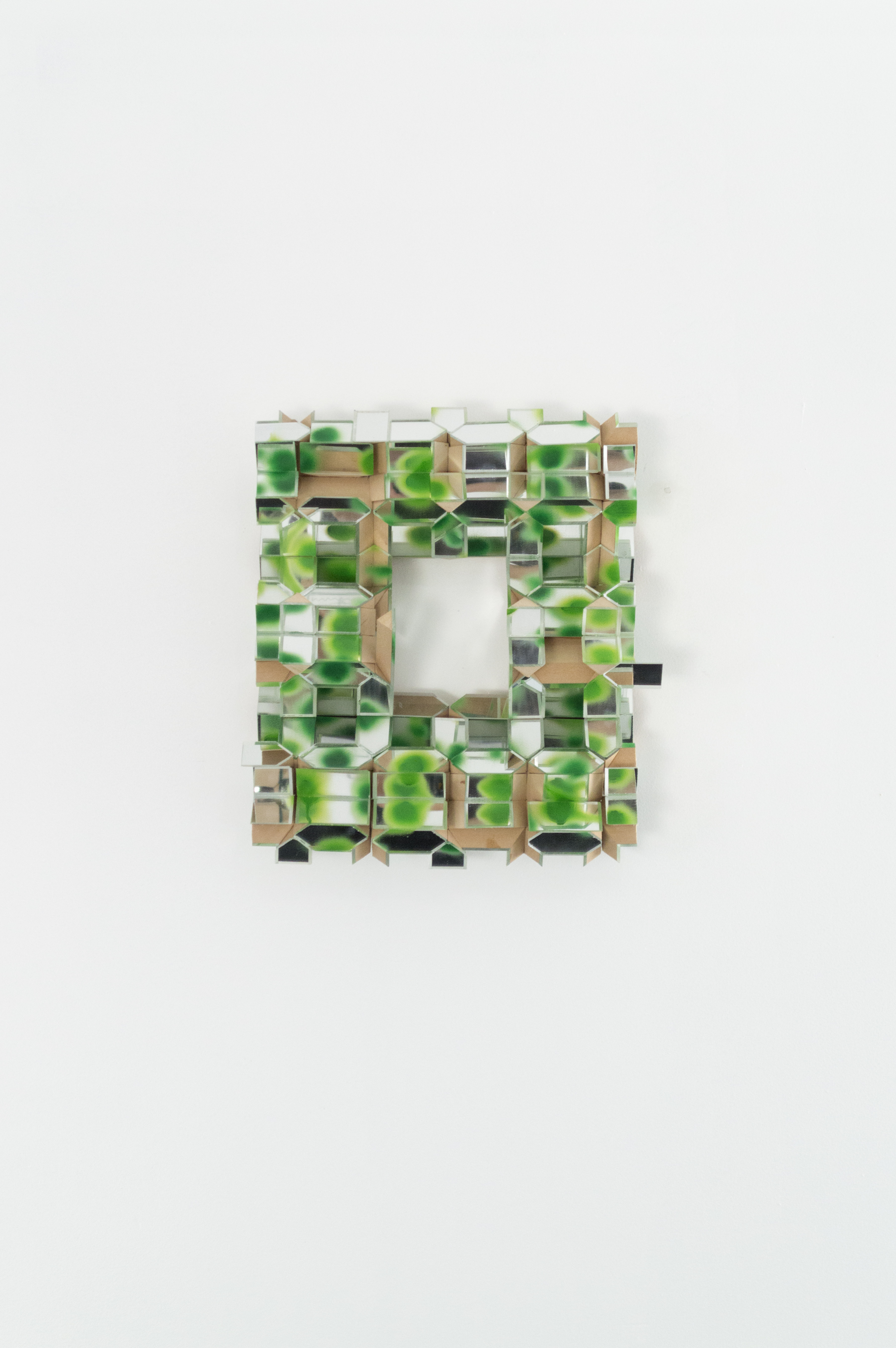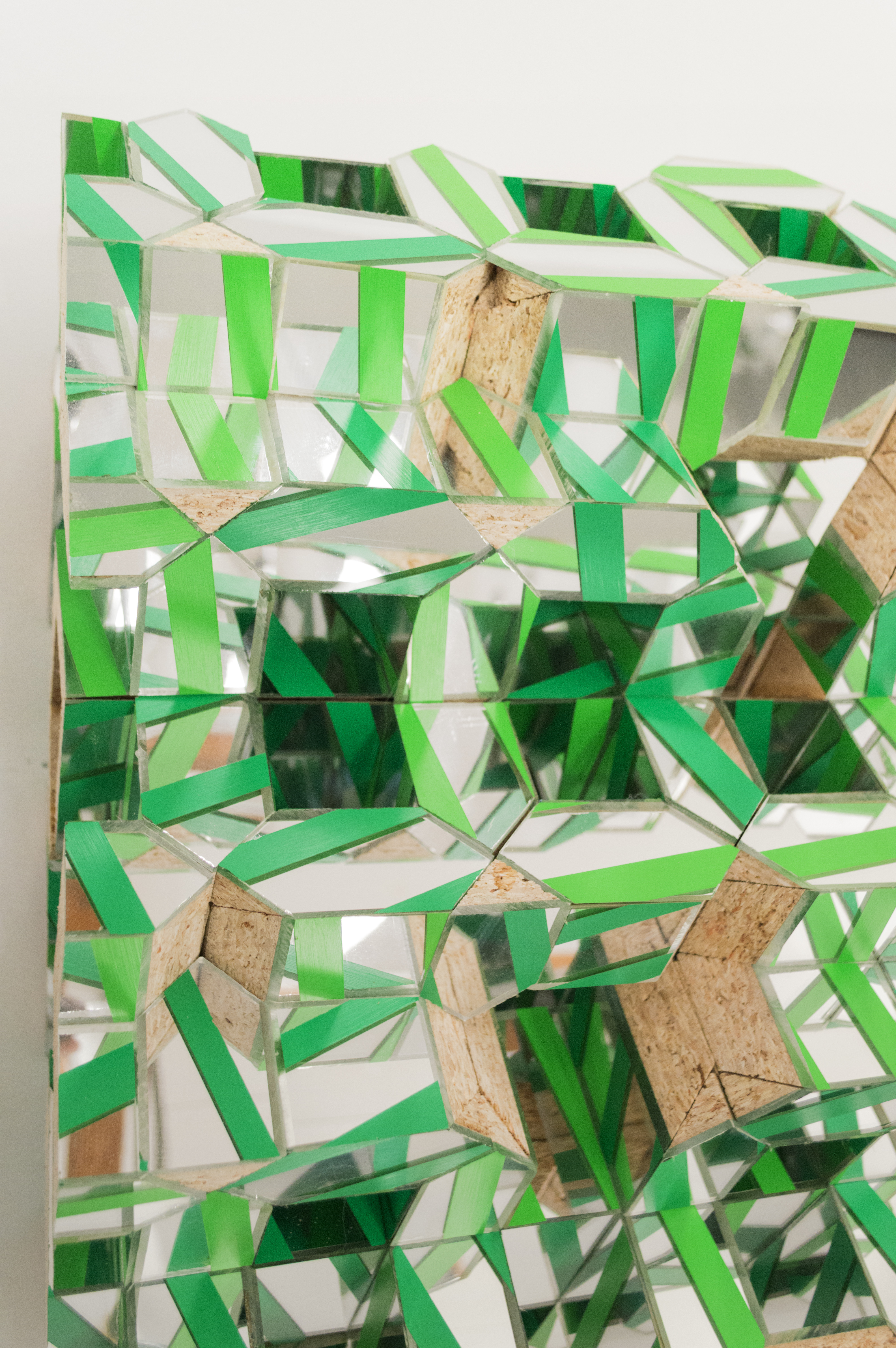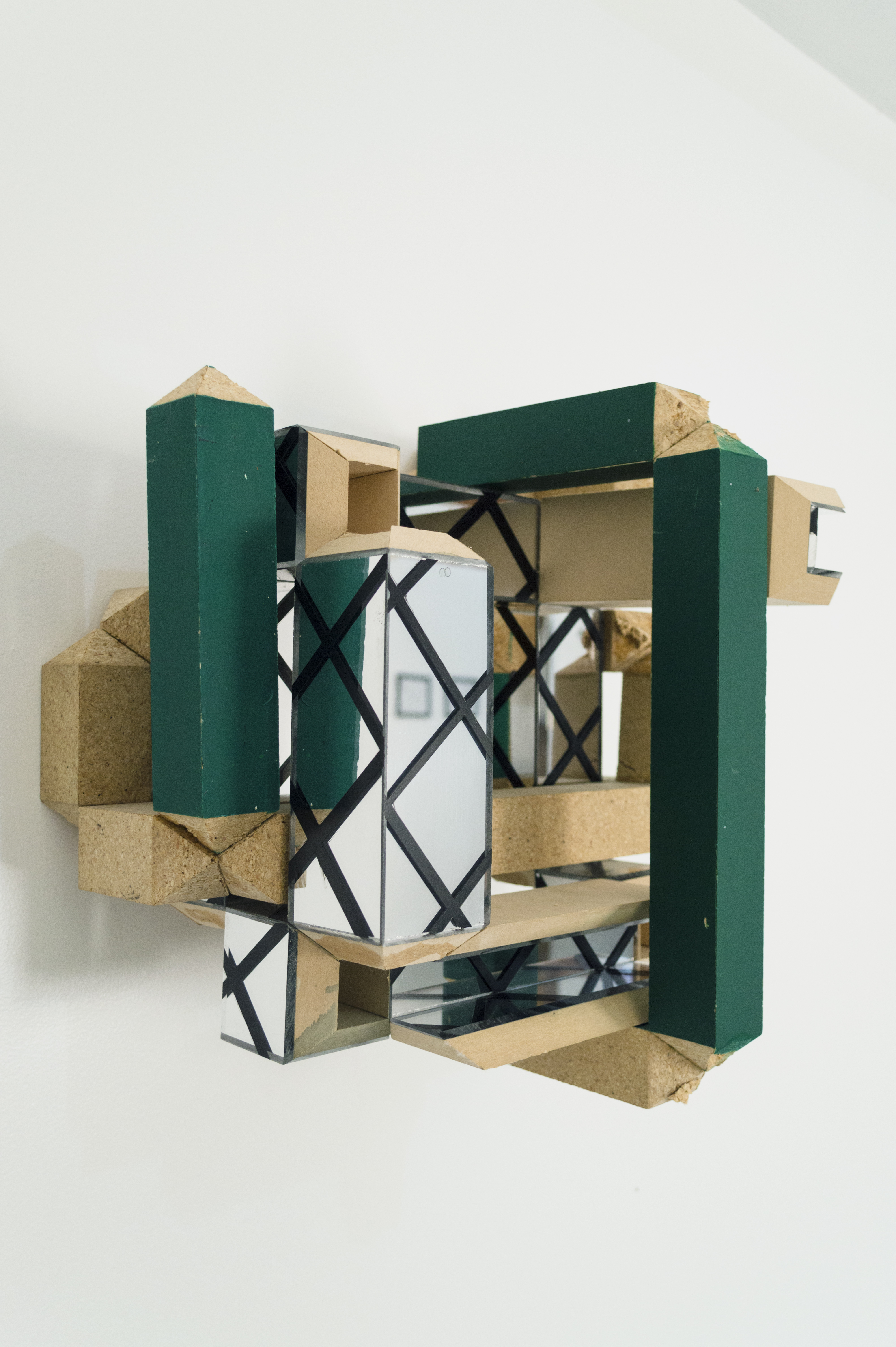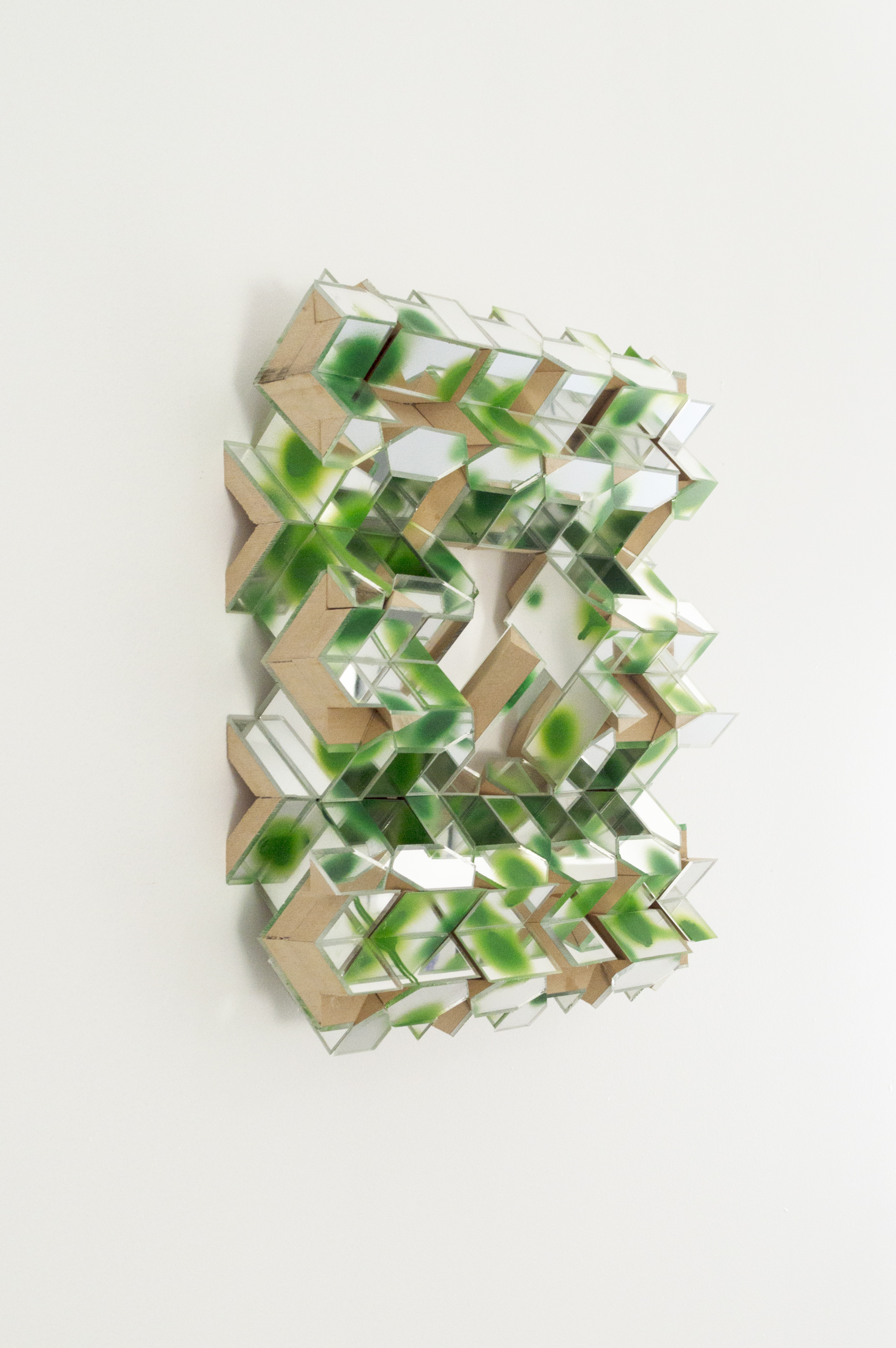 Charlie, in a different way, deals with the envelope in his work, looking to the materials themselves to guide his process. Synthesizing traditional craftsmanship with experimentation, Charlie has developed an idiosyncratic art practice that, taken as a whole, constitutes a kind of self-generating universe. He makes his work within a strictly defined set of materials and processes, such as limiting his paint palette only to shades of green. The work on view here are a series of wall-mounted sculptures that, while clearly defined by their limited materials (plexiglass, acrylic paint, MDF,) are left radically open. He leaves much of the area beneath the surface of his works visible. A sleek, finish-fetish aesthetic gives way to MDF and chipboard. The band-saw cuts on the plexiglass and wood can be seen, glue bubbles out of seams where pieces of material have been joined, cross-sectioned. These works present a kind of synthetic cubism to the viewer, ecstatically deconstructing themselves and everything they reflect.