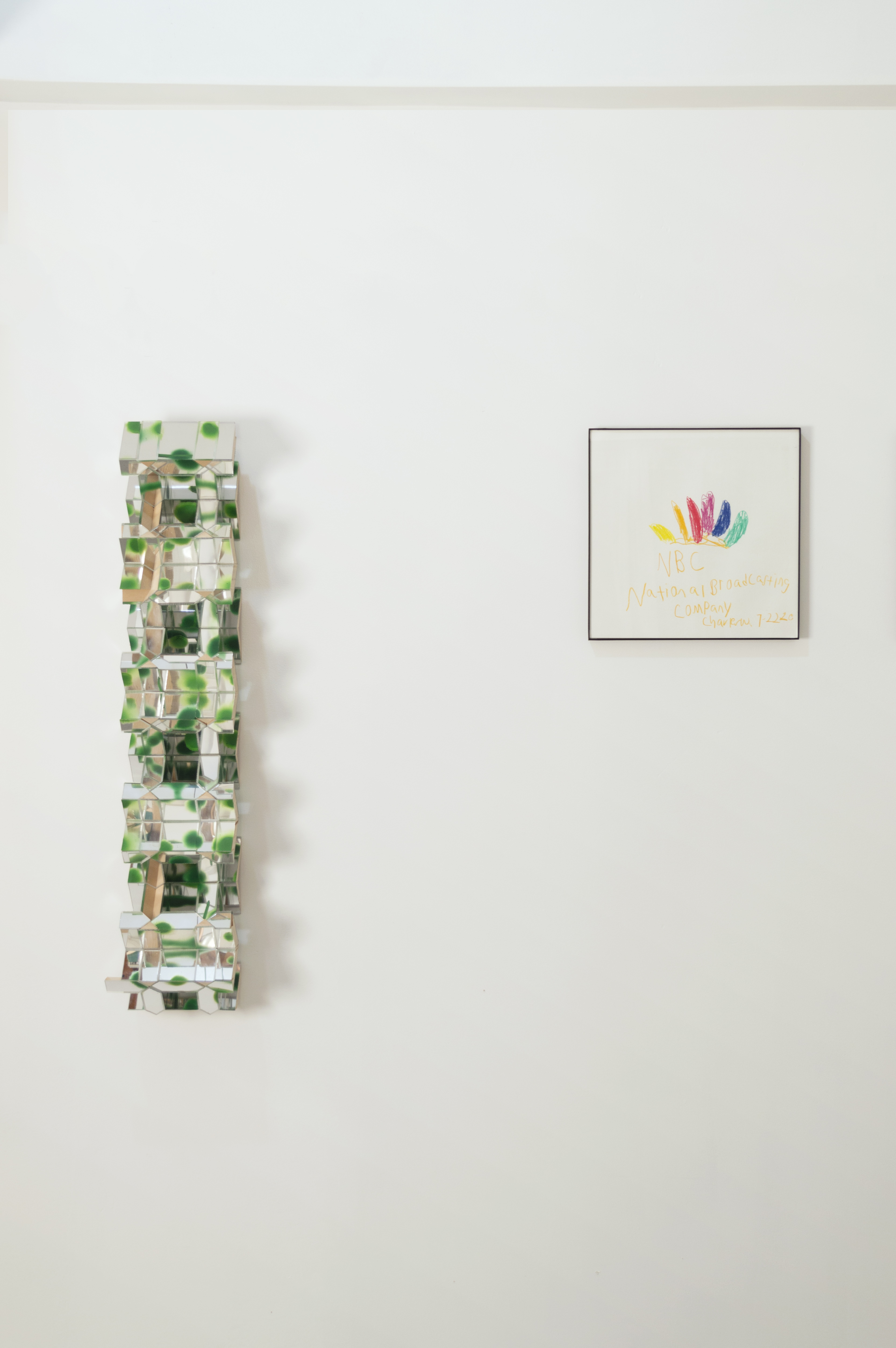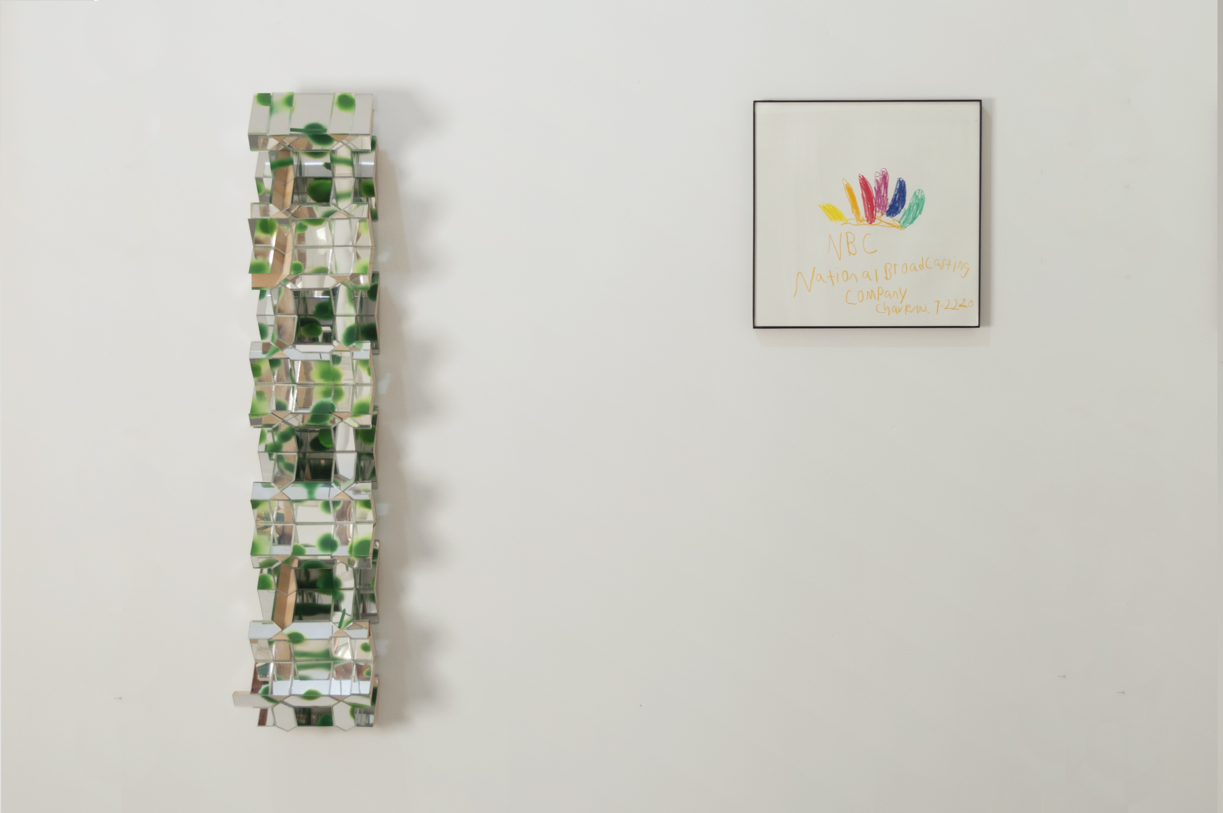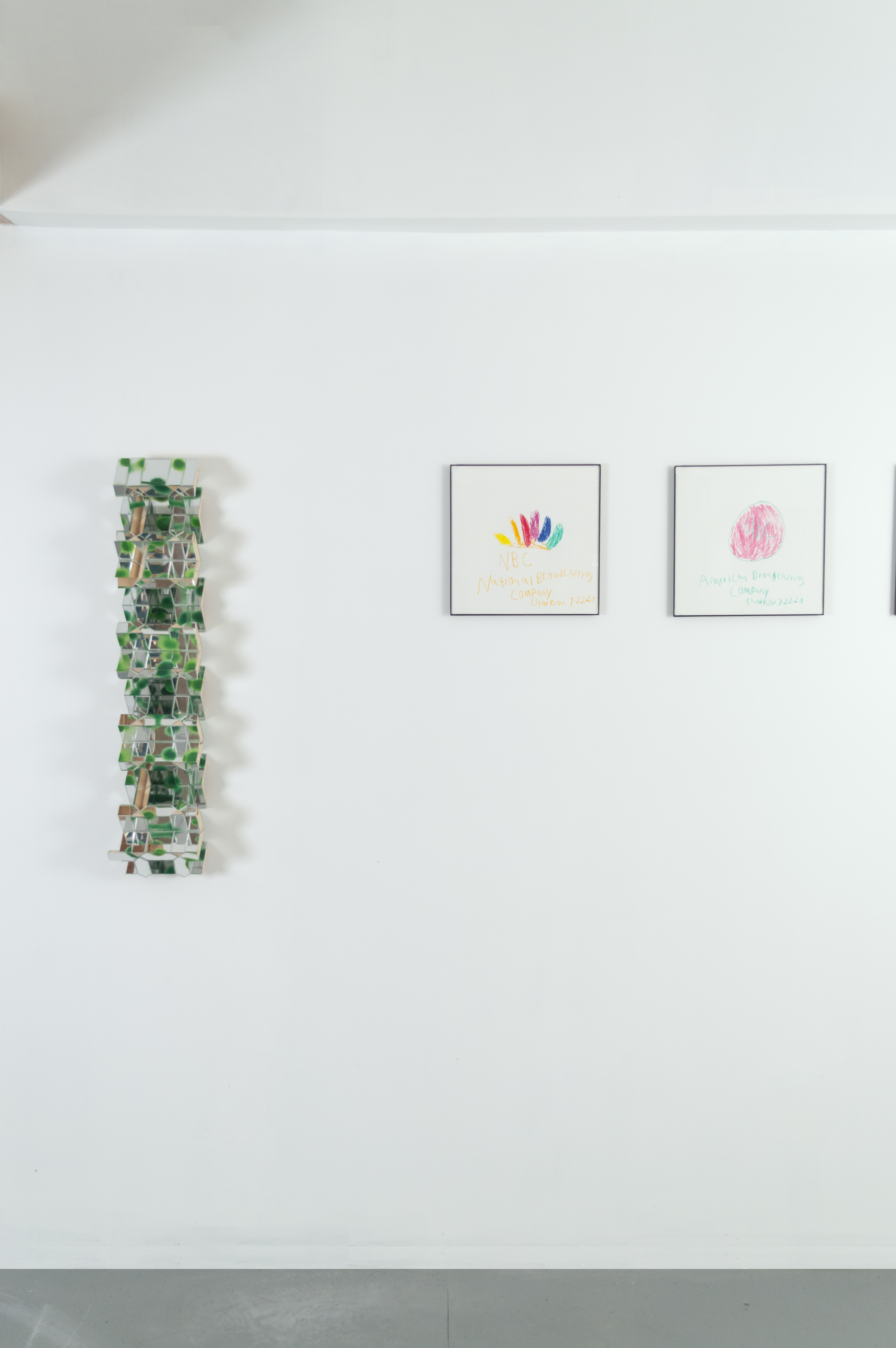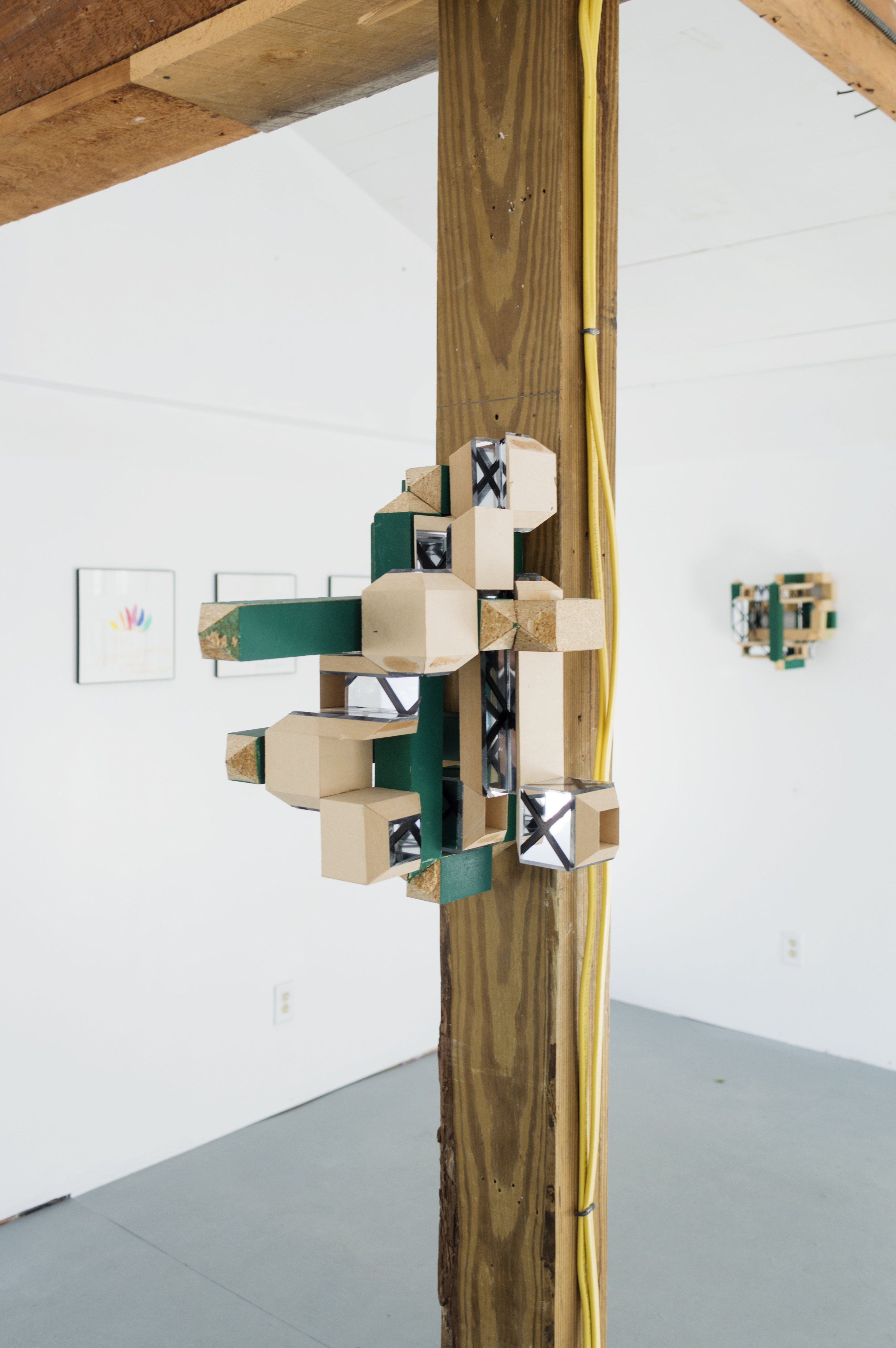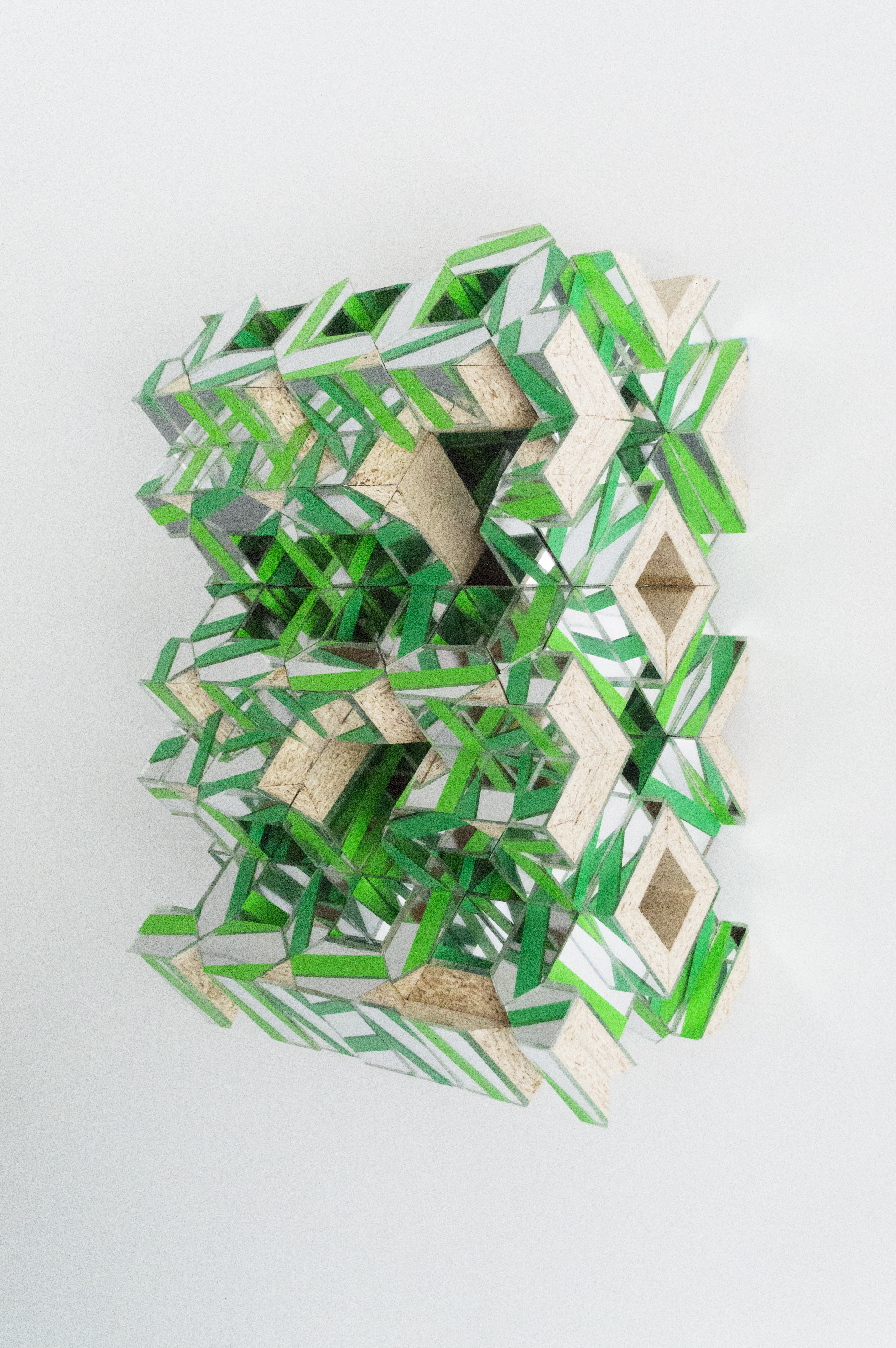 Charlie, in a different way, deals with the envelope in his work, looking to the materials themselves to guide his process. Synthesizing traditional craftsmanship with experimentation, Charlie has developed an idiosyncratic art practice that, taken as a whole, constitutes a kind of self-generating universe. He makes his work within a strictly defined set of materials and processes, such as limiting his paint palette only to shades of green. The work on view here are a series of wall-mounted sculptures that, while clearly defined by their limited materials (plexiglass, acrylic paint, MDF,) are left radically open. He leaves much of the area beneath the surface of his works visible. A sleek, finish-fetish aesthetic gives way to MDF and chipboard. The band-saw cuts on the plexiglass and wood can be seen, glue bubbles out of seams where pieces of material have been joined, cross-sectioned. These works present a kind of synthetic cubism to the viewer, ecstatically deconstructing themselves and everything they reflect.