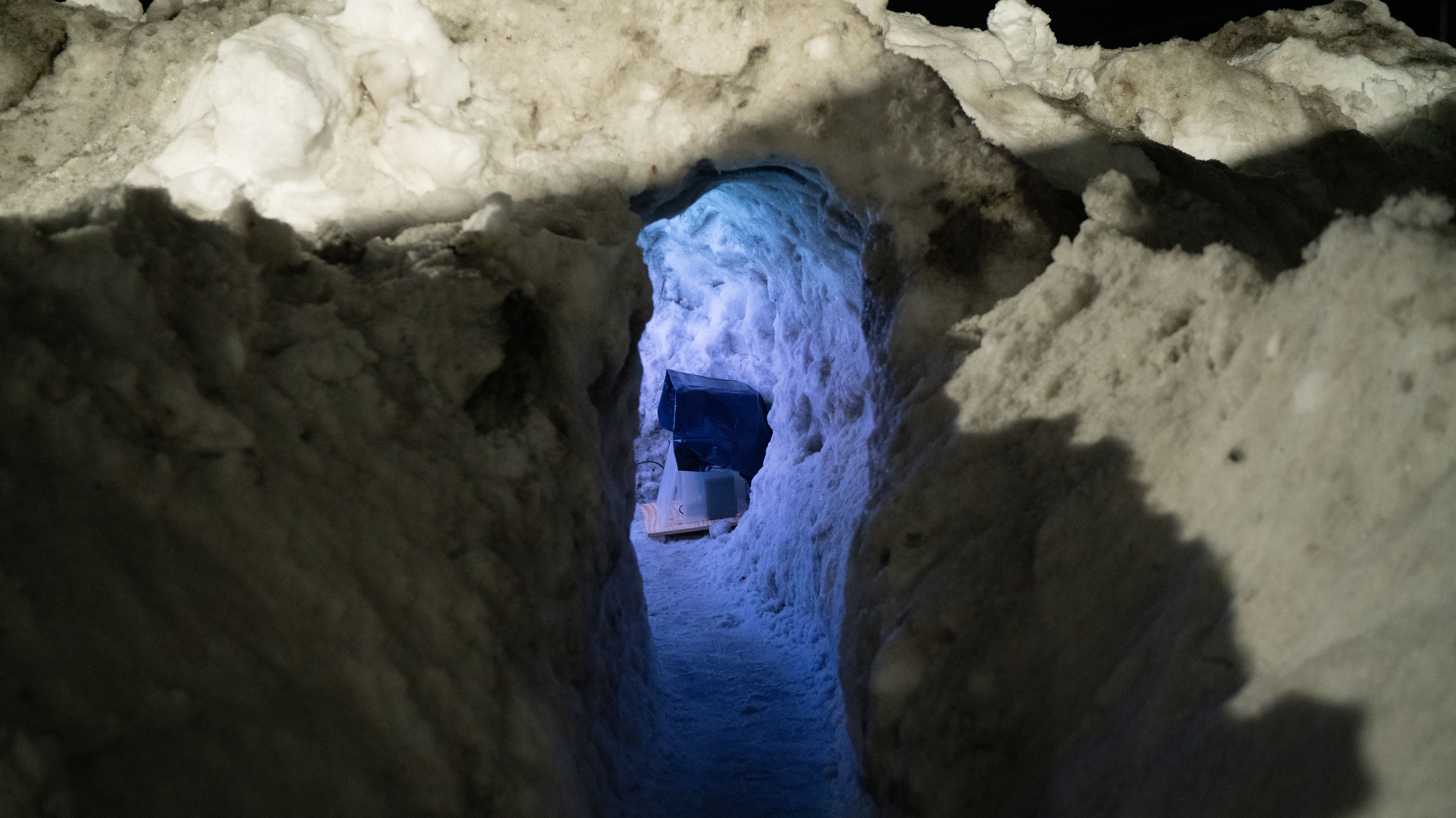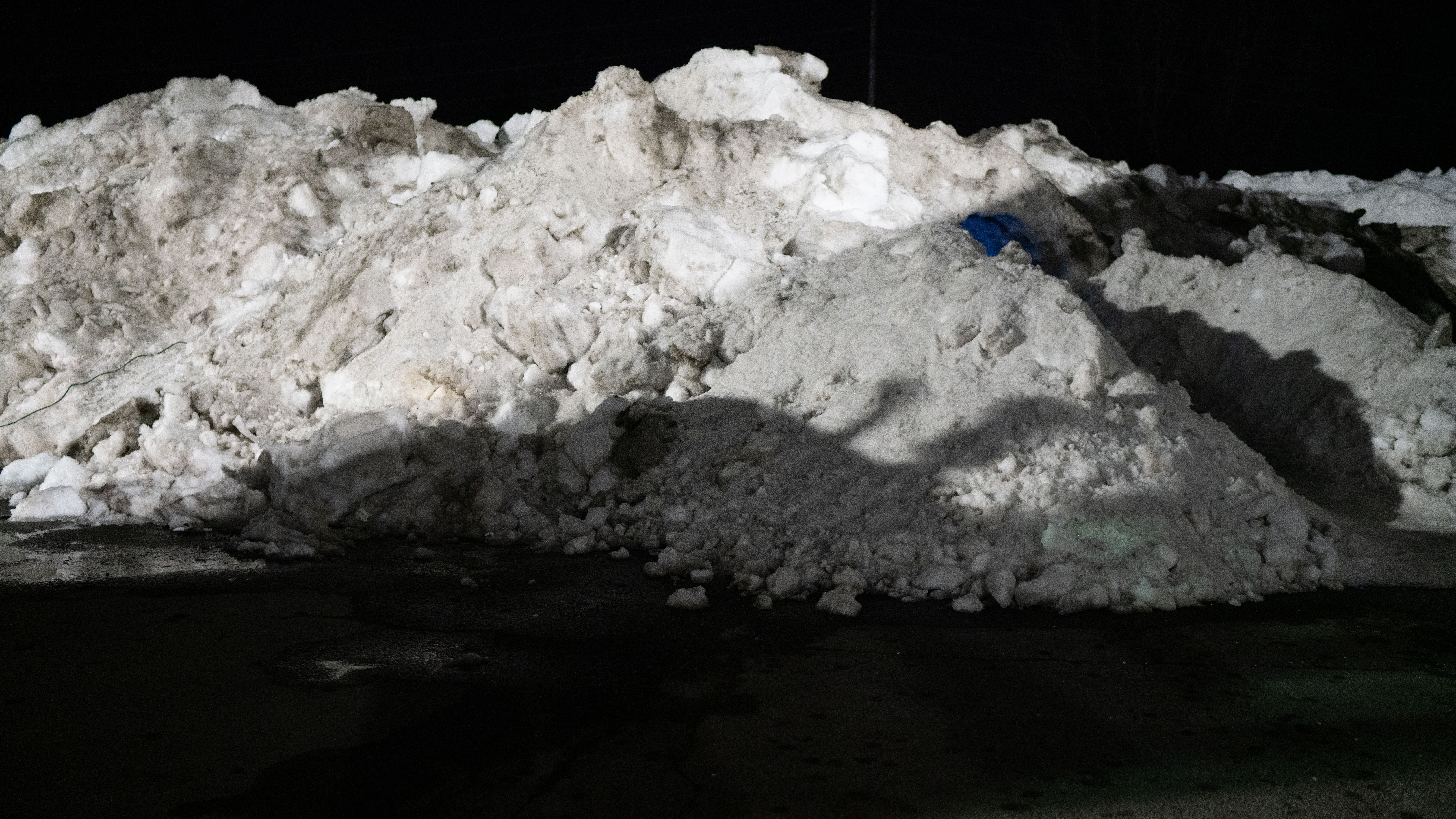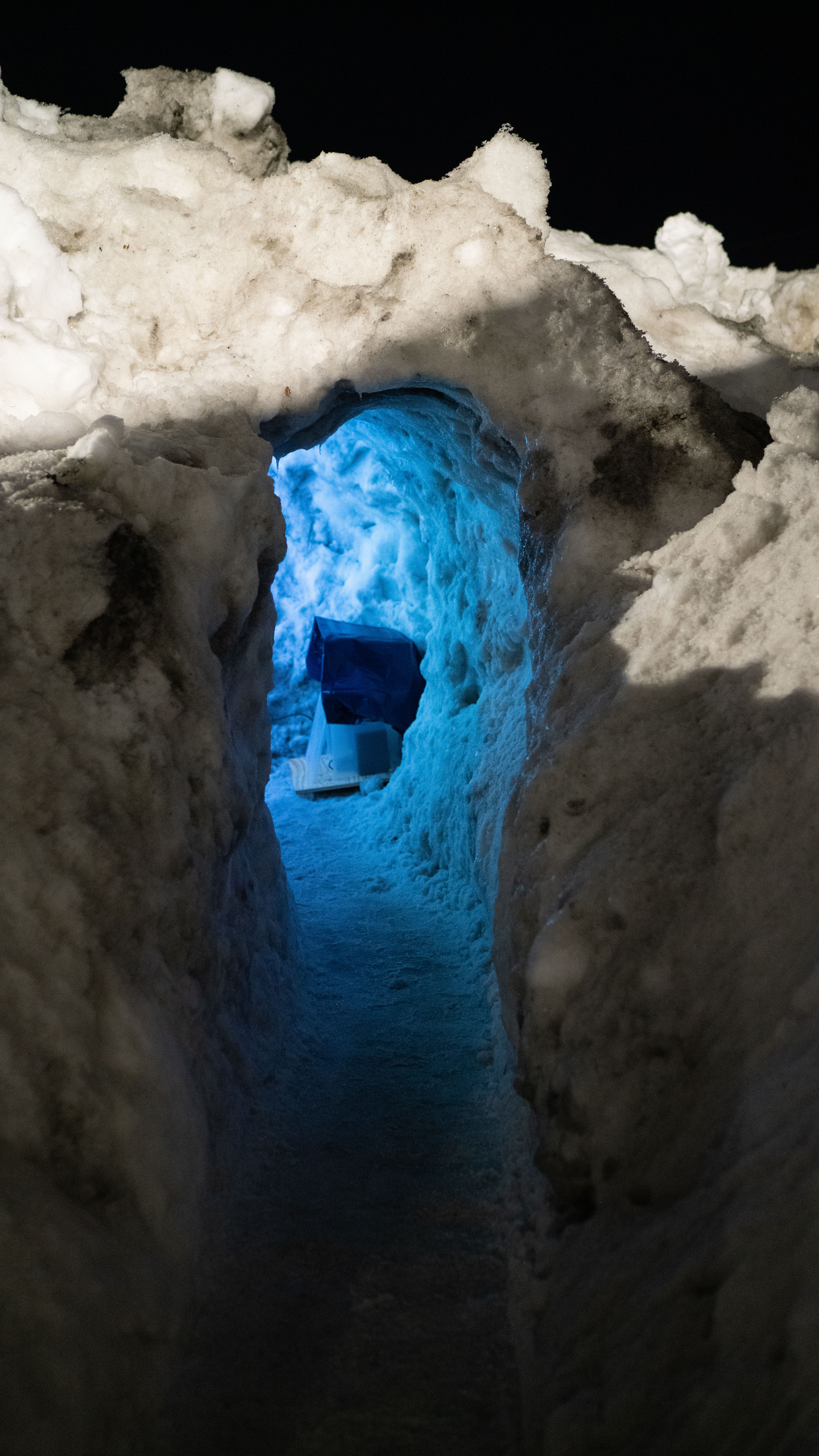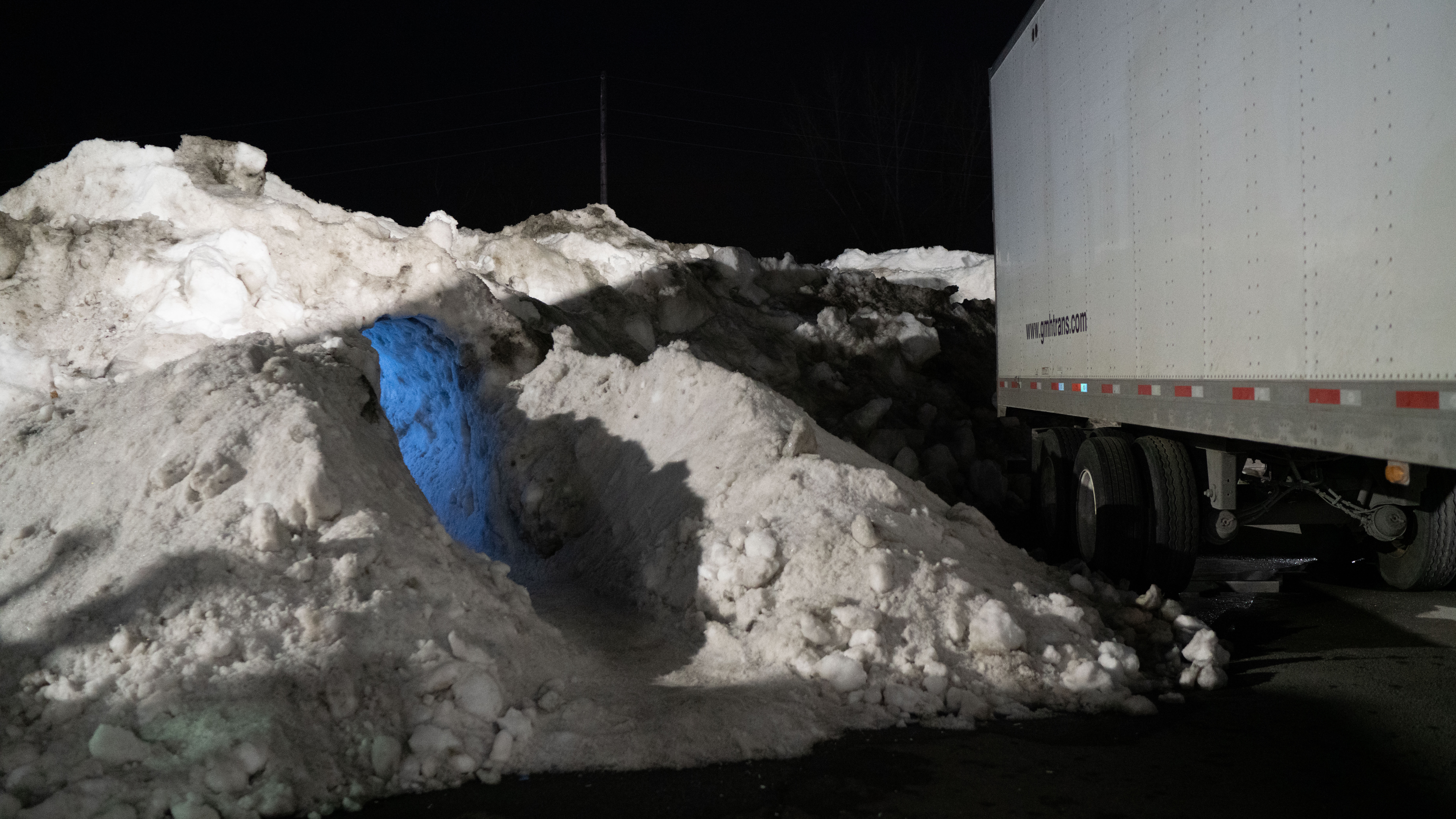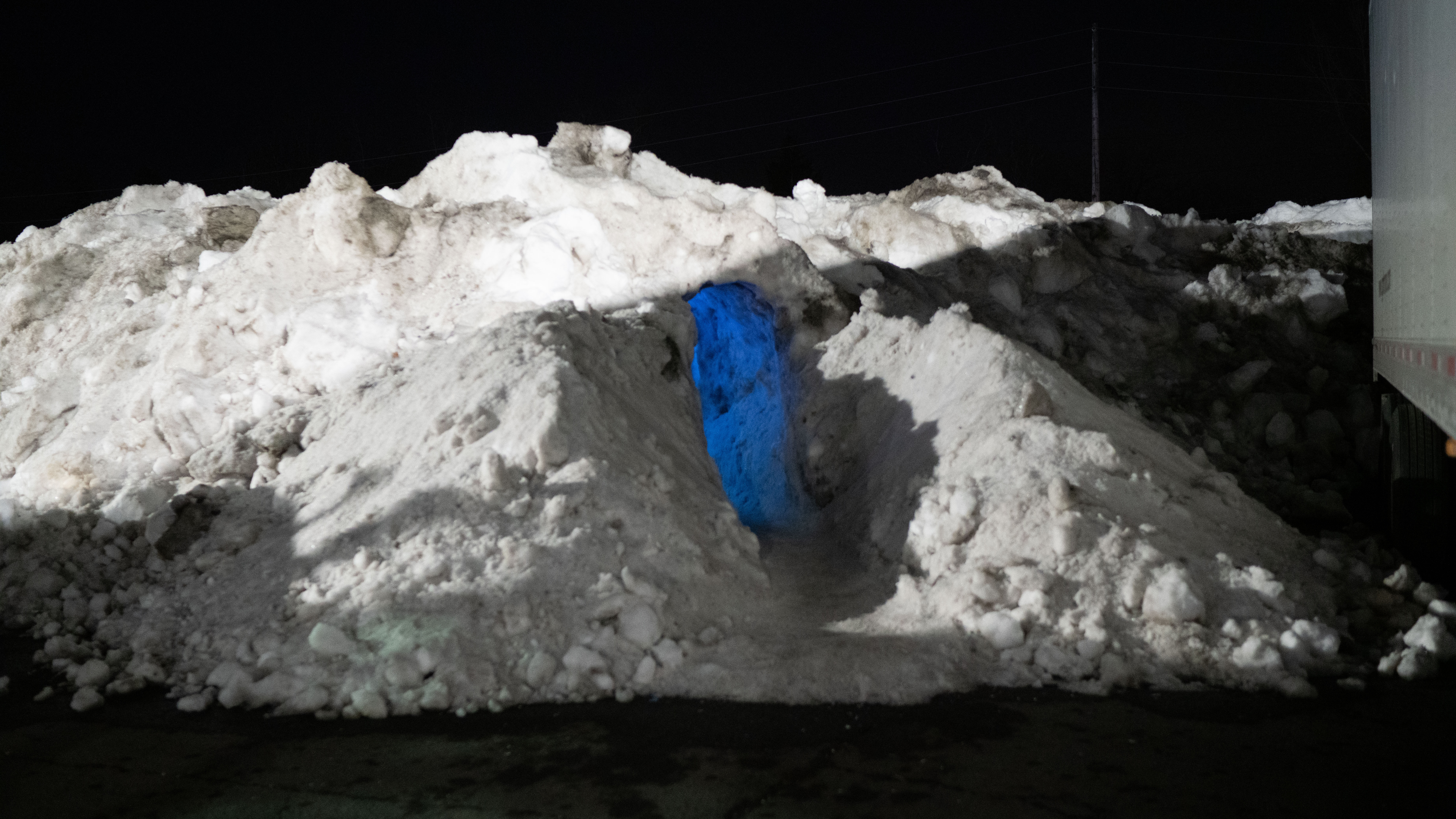 Baba Yaga Gallery is pleased to present Turning, a video by Lorenzo Bueno, in a hollowed out snow pile in the old Shop Rite parking lot in Hudson NY on Friday February 25, 2021.