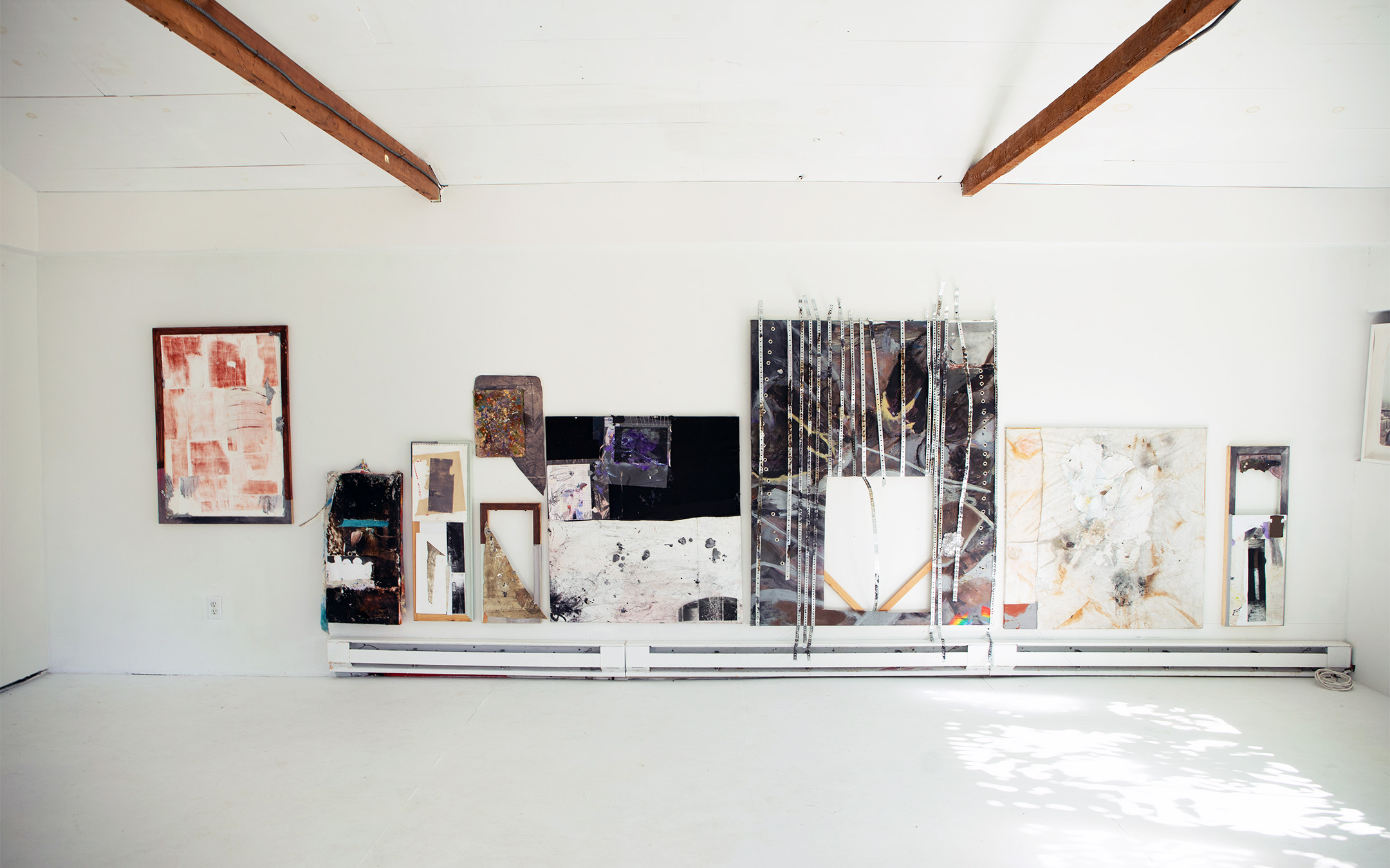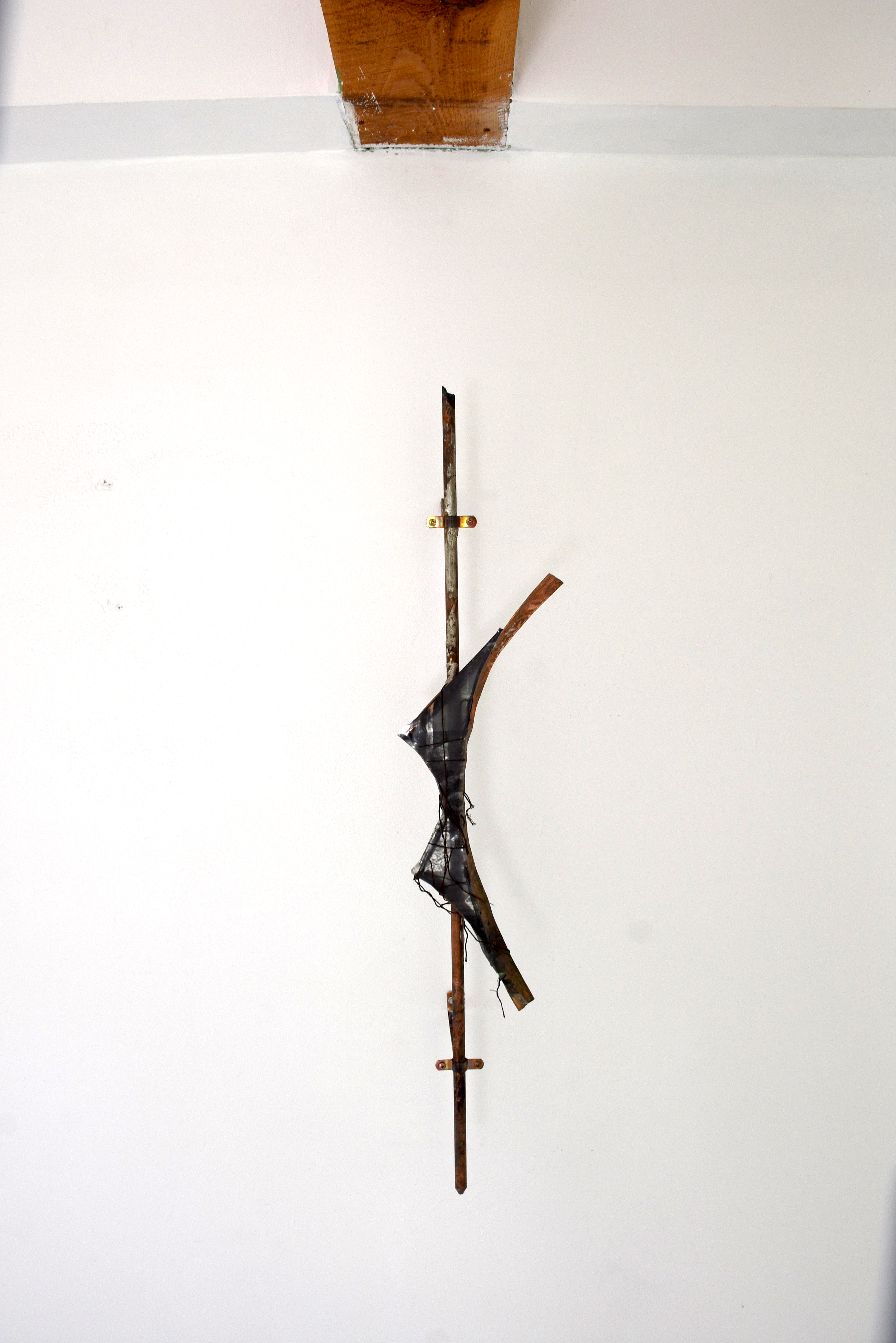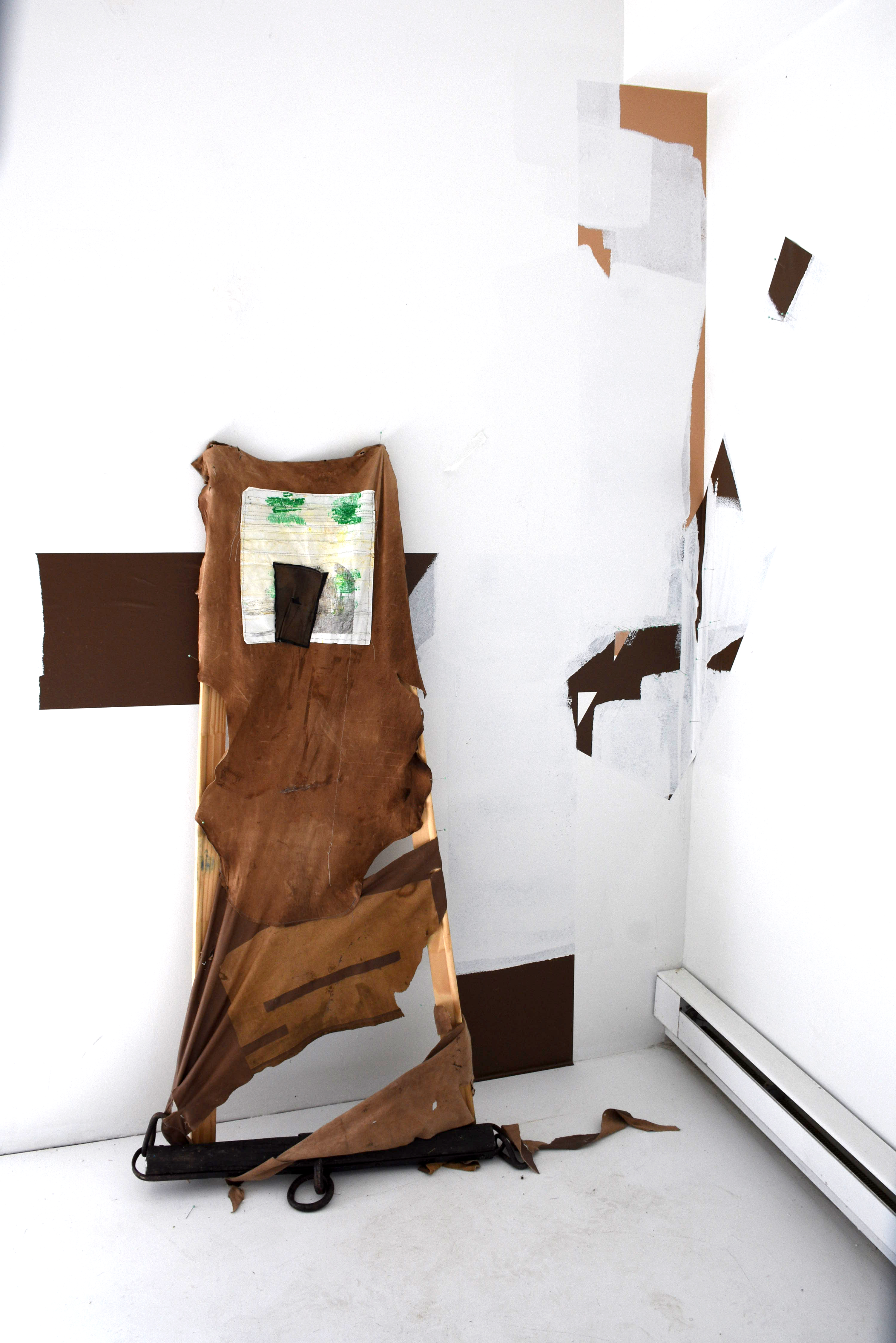 Caleb’s work is rooted in the tradition of Black Southern assemblage, a legacy he redefines and expands upon. With a background in photography and an output that is categorically sculptural, Caleb brings a vortex of materials and associations to every object he produces. In a single work we can find examples of sewing, photography, painting, even aspects of plumbing and pipefitting. A photo-lithograph of a dilapidated house in an overgrown forest may be printed and sewed onto laser etched leather, adhered to stretcher bars, painted on, and then fused with copper pipes, some of which are hammered down, flattened, eyelets hammered in. Paint might then be applied while wet, or used as a material like any other, dried first and then applied sculpturally to the work “Jack-Whitten-Style.” Note that the act of sewing in the context of this work bears an association to Alabama’s Gee’s Bend quilters (Caleb has visited Gee’s Bend in person) whereas his use of copper pipes is both pragmatic and autobiographical; by trade, Caleb is a plumber. Materials like Oakum, a fiber sometimes mixed with molten lead to seal old cast iron pipes, finds its way into the work. Caleb saves the over-pours. Flux, a material that allows solder to flow, is intentionally left on pieces of copper, creating a green patina as it oxidizes the metal. He mentions objects like a “vintage cow toe” he found in York, Alabama, and describes his work as a fusion of movement and creation, traveling being “part of how the work comes together, hauling material.” The resulting works are aware of their past, cognizant of their current state, and projecting substance into the future, all at once.