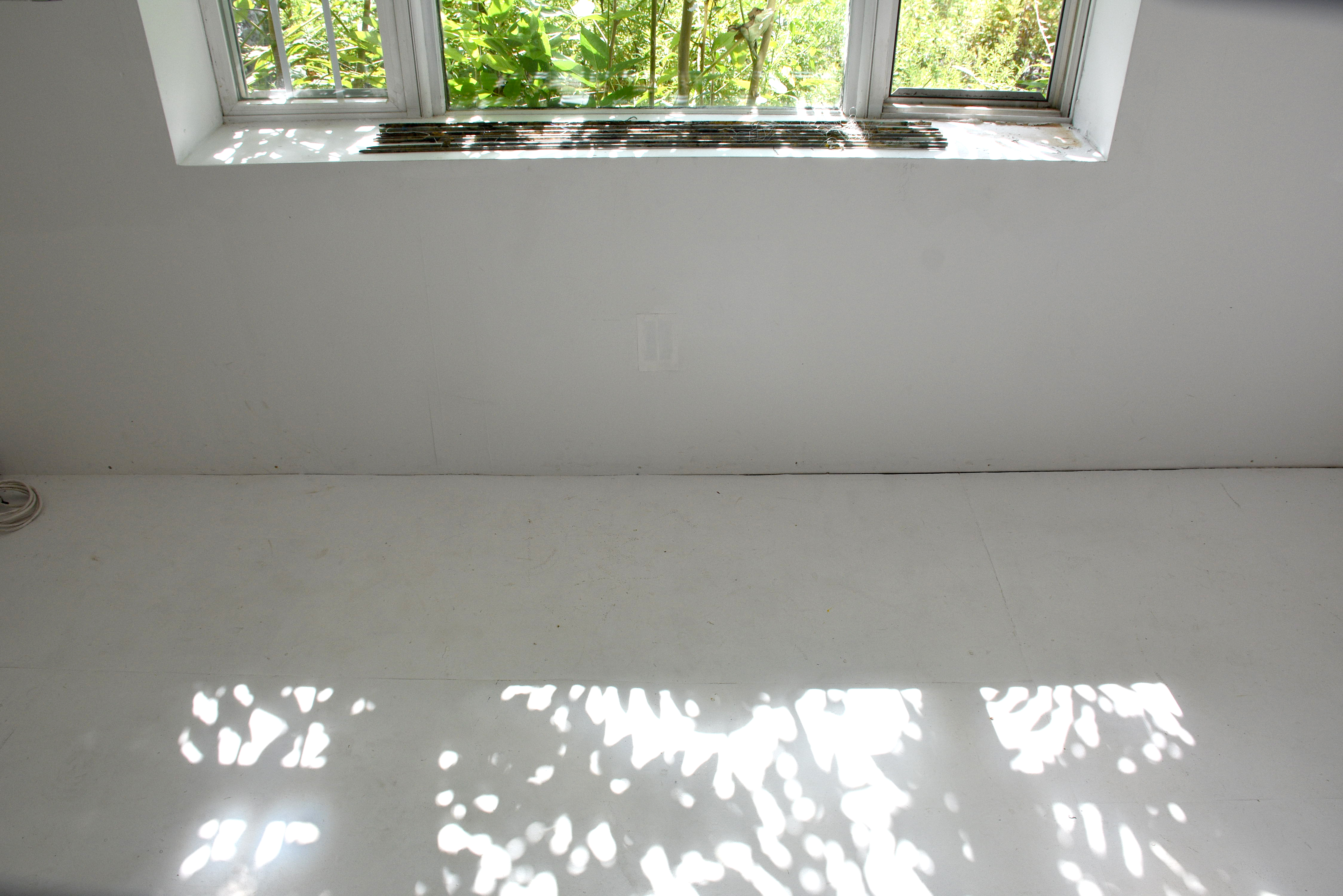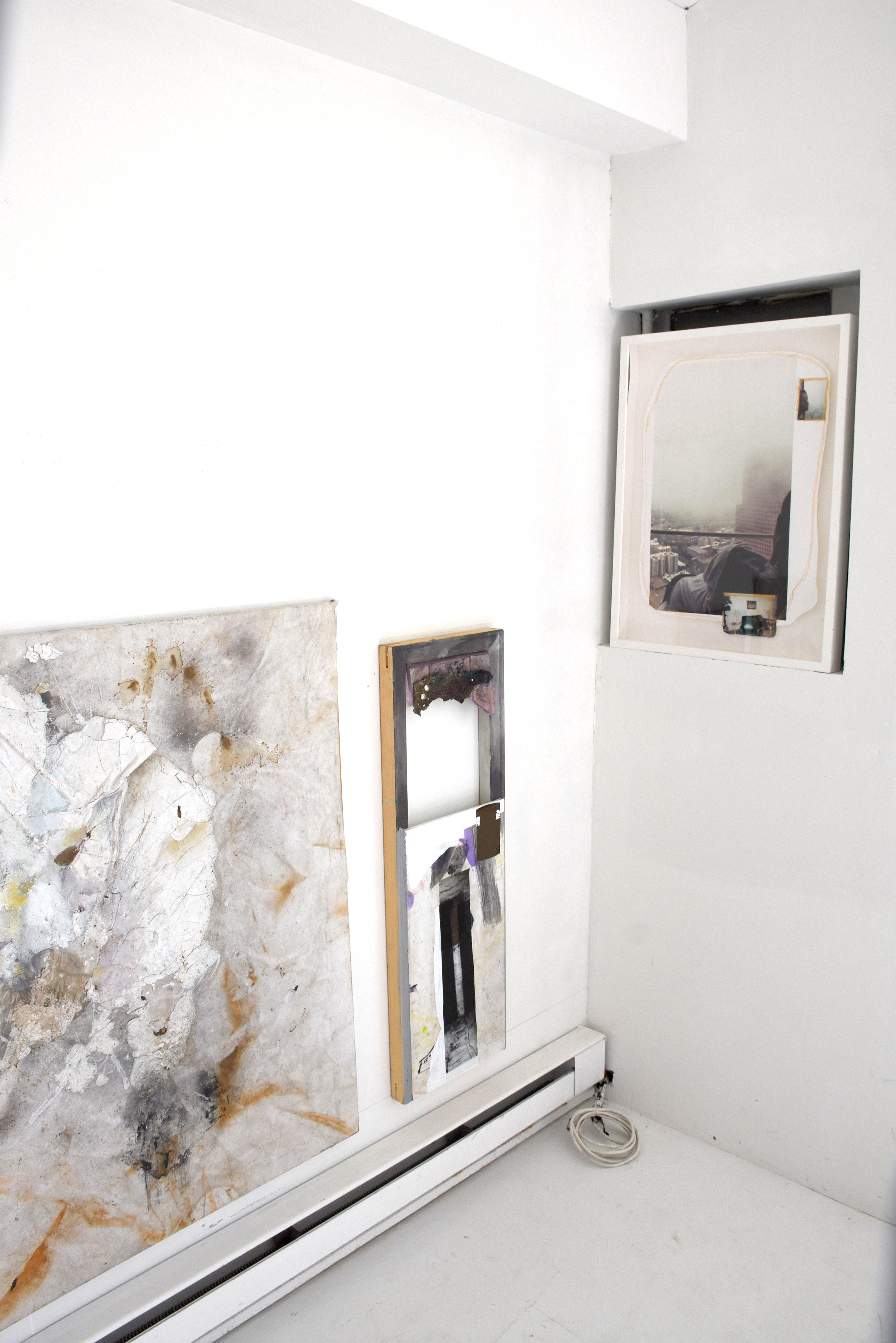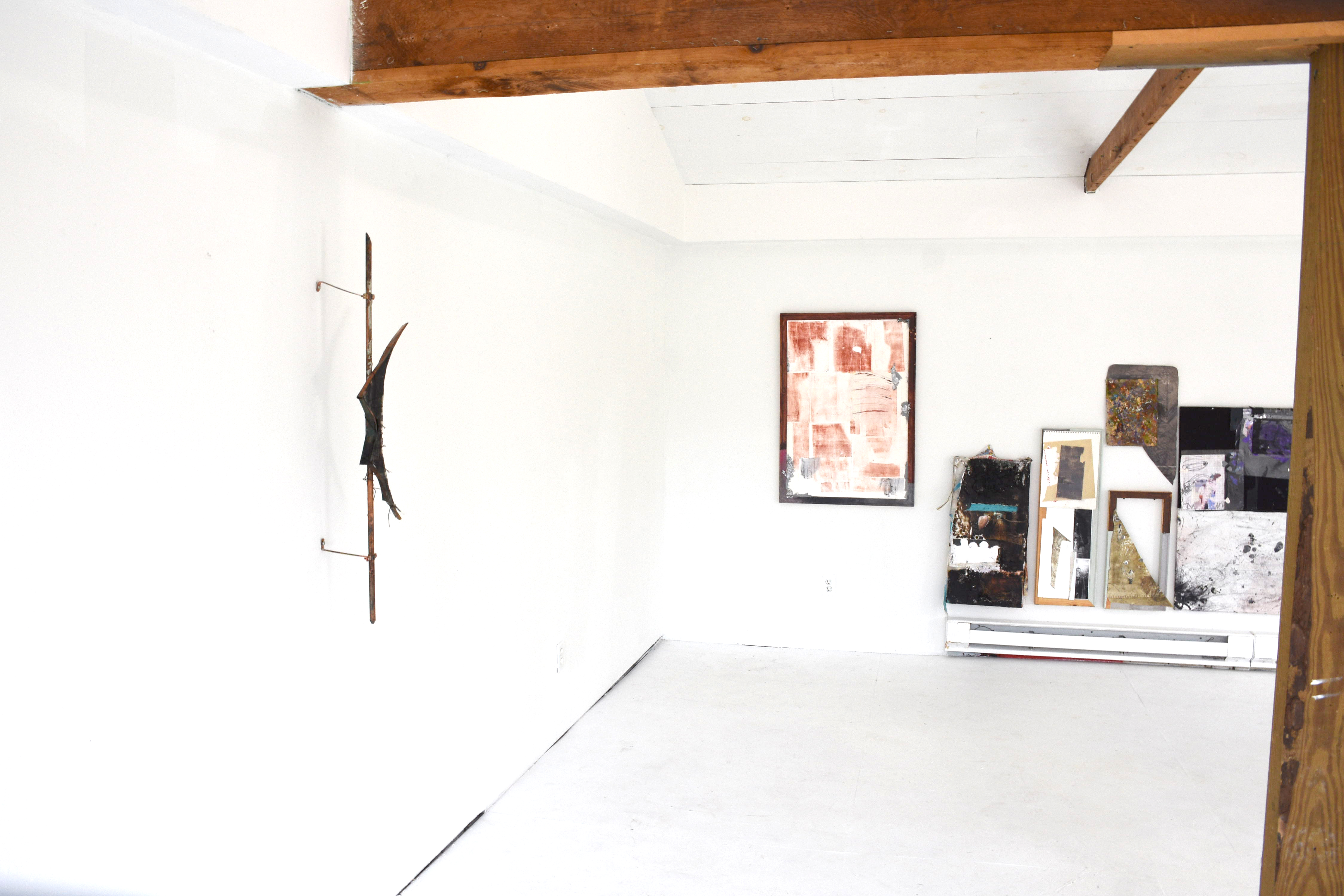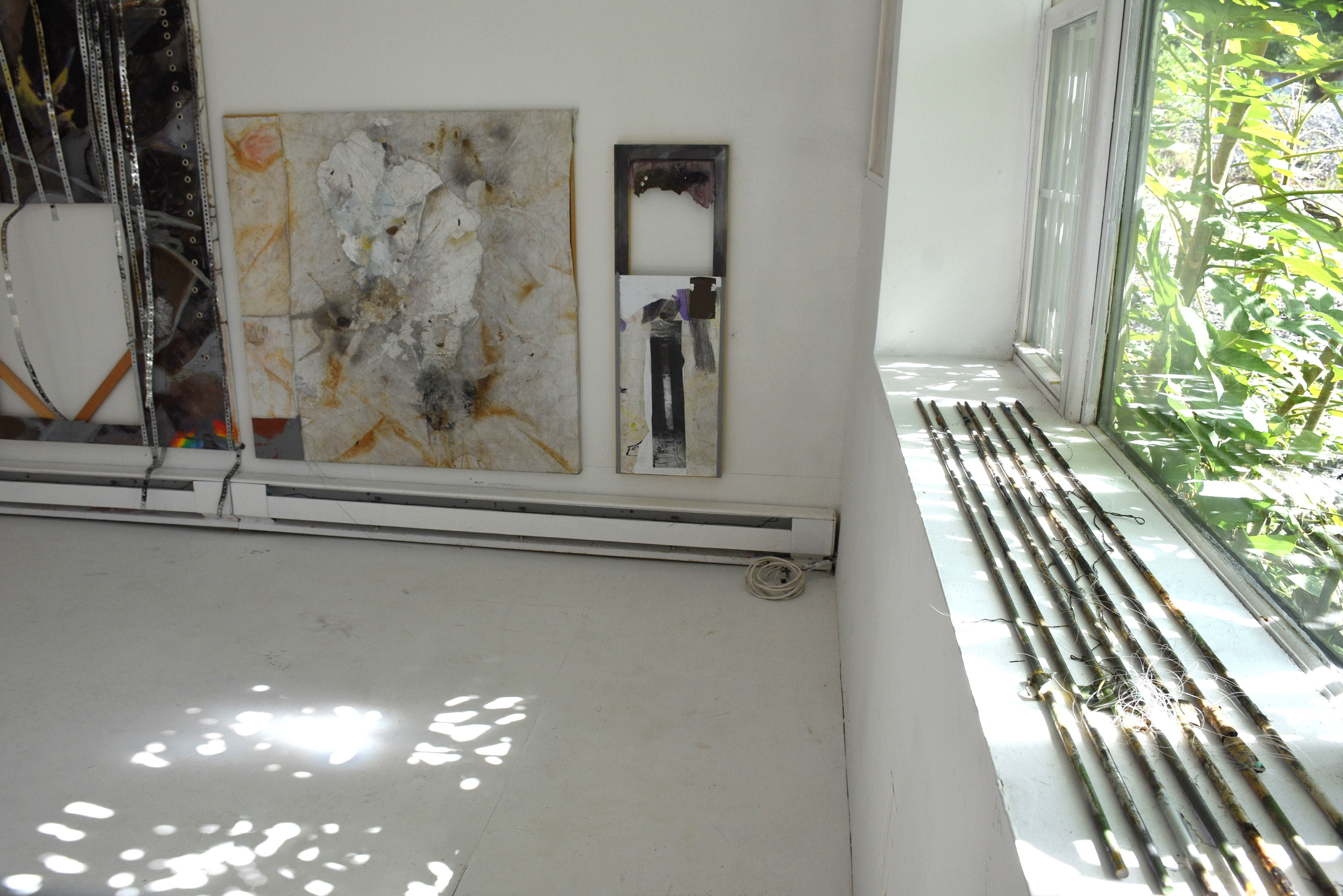 Caleb’s installation at Baba Yaga is called sweat-study. He speaks of sweating’s relationship to privacy, the idea that it’s something preferably done at a distance, “gross but necessary,” possibly like making art. He mentions the idea that “you get a little nervous and start sweating, and then you get even more nervous because you’re sweating…” The parallel to his production method seems evident here. Caleb’s work is usually made in a studio environment where a multitude of works are simultaneously fermenting, bubbling over, being added to, subtracted from, recombined or, tellingly, literally brought outside to absorb the energy of the weather. These objects accumulate more and more material naturally over the course of their production, collapsing time upon their eventual completion. The non-linear aspect of the work is central to it, and sometimes the process can take years. Caleb’s approach is a form of abstraction that lacks adequate language to describe. He’s planting wildflowers, “not trying to illustrate something.” He points out that he’s specifically not creating images, but is interested in how the object interacts with people on a physical level. The artist imagines this show as an EP: not a single and also not an album, an EP is something in between. Every track (or artwork) is important, but there are only a handful of them, and when taken together and read left to right, their titles constitute a poem.