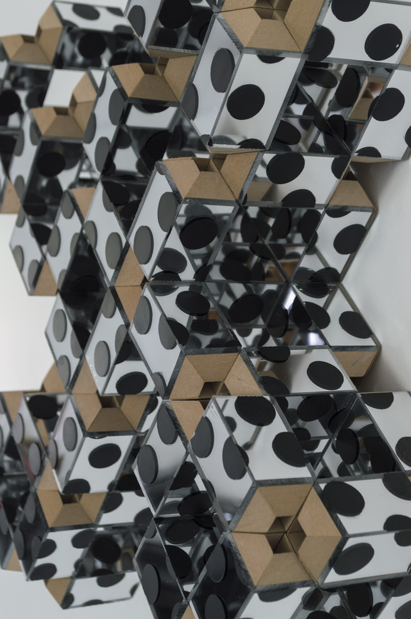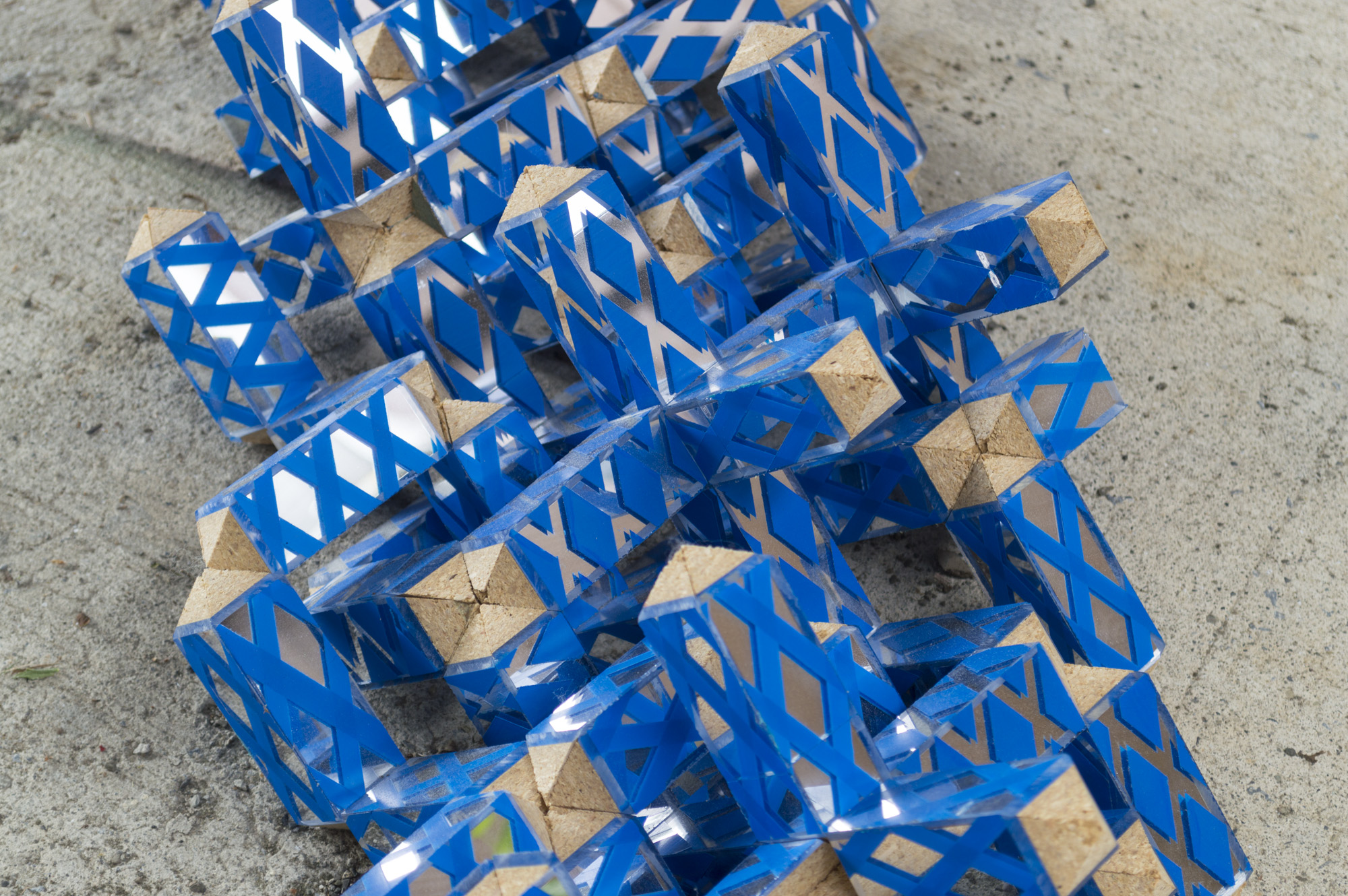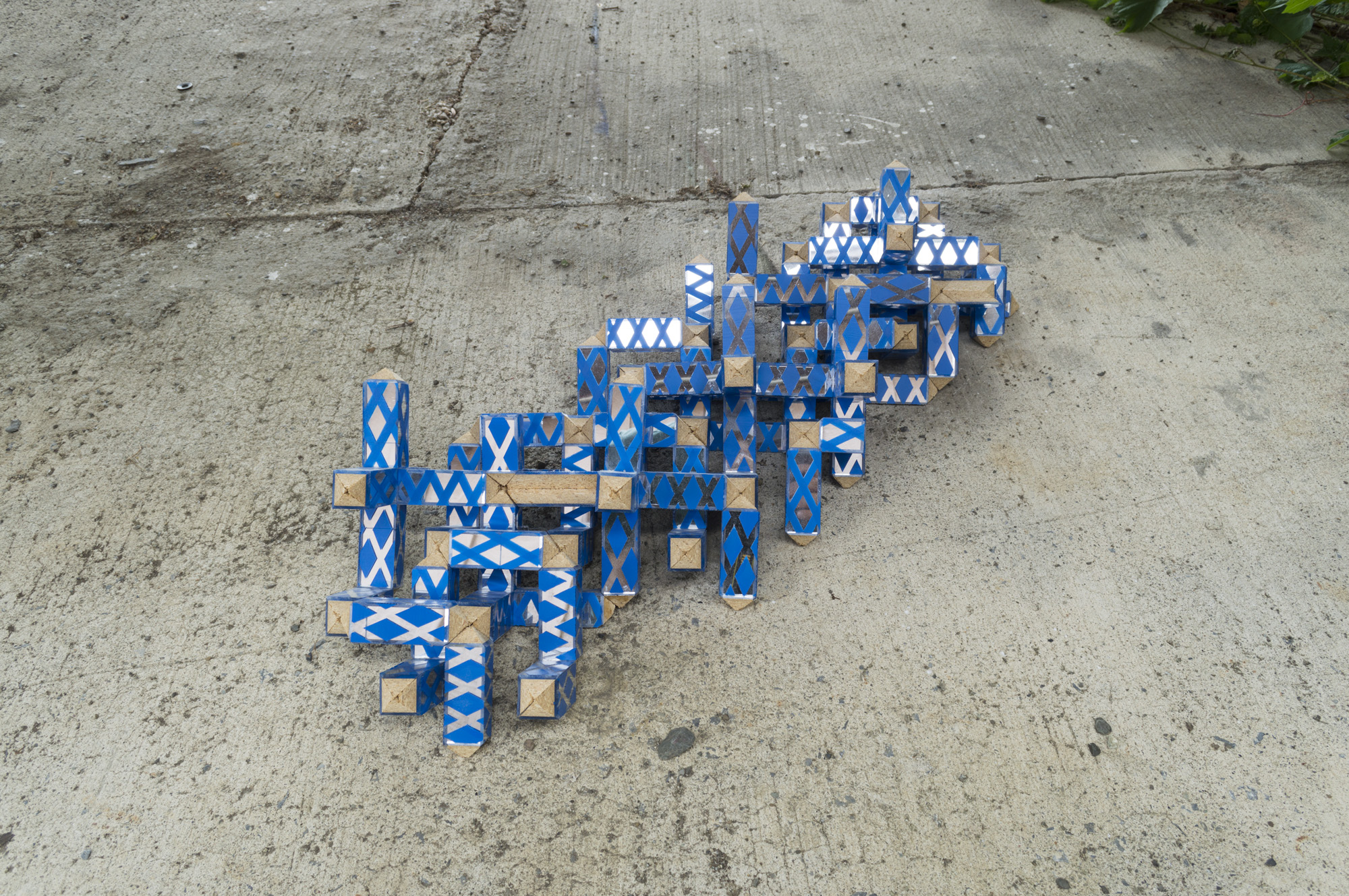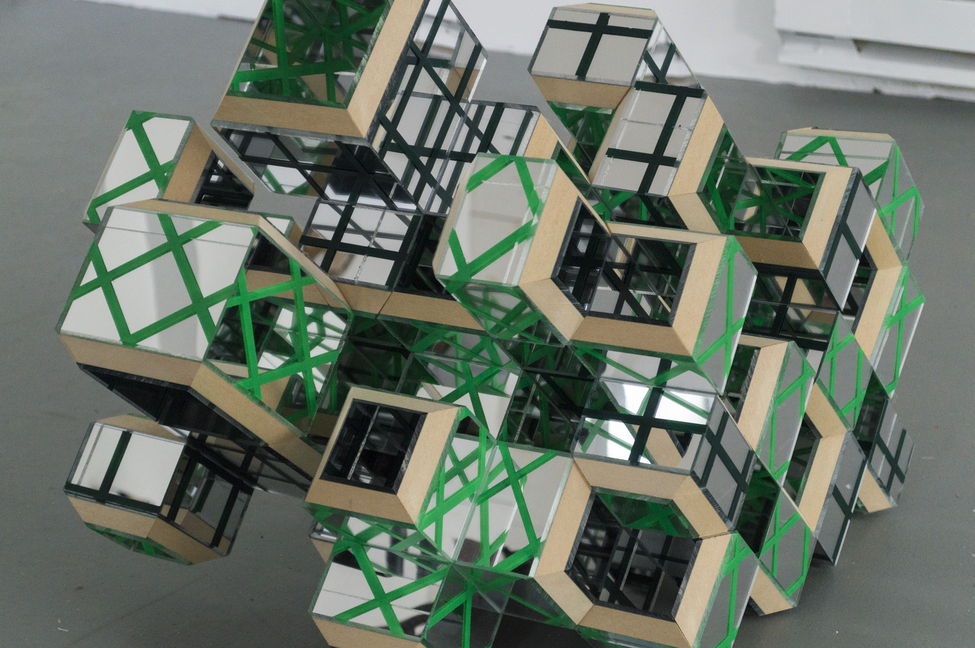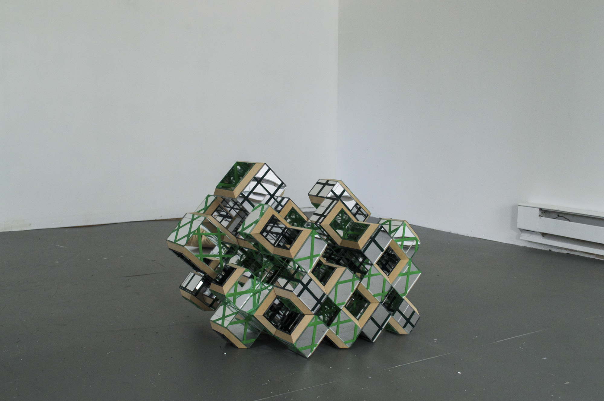 Cinema is an exhibition of sculptures by Charlie Smith. The show title’s reference to moving images affirms a certain quality of Smith’s works that I’ve perceived without a precise term to describe it. ‘Cinema’ is not that precise term, but perhaps more apt in its proximity and simultaneous maintenance of an ambiguity. There is motion in the sculptures. There is implied motion in their tessellated structures—they could turn and comfortably reorient on a new axis, they could cascade and tumble from and into one another. But there is also actual motion derived from the mirrored surfaces of several works. Walking around Tortoise, reflections kaleidoscope around it. I catch parts of my reflection in at least a dozen little frames, like a short sequence of film strip cut into individual cells and scattered.