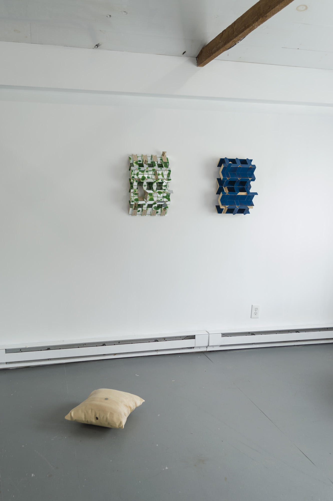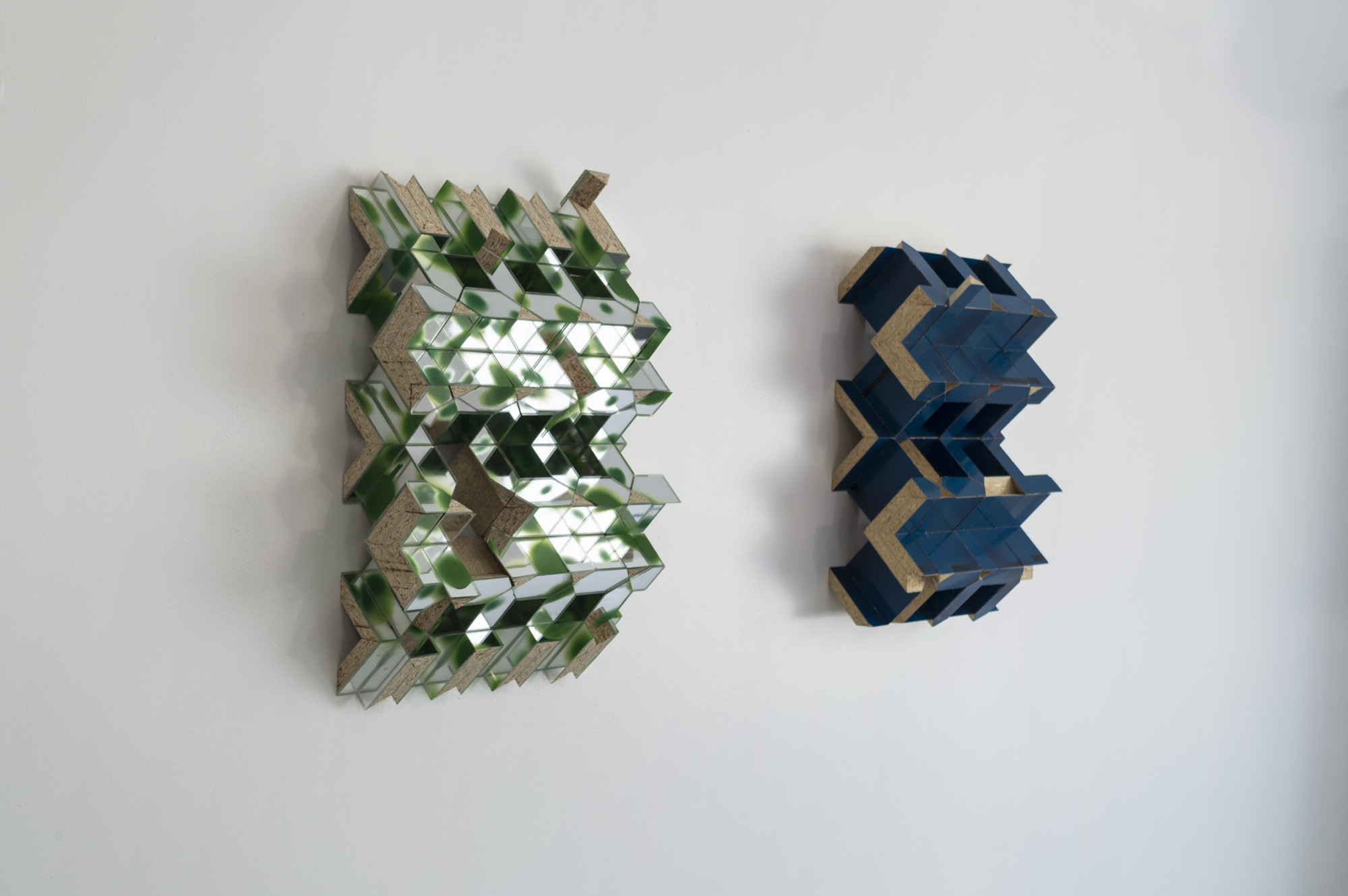 Carapace, 2020. Acrylic paint, Acrylic mirror, Particle Board and Untitled (Blue,) 2018. Acrylic paint, Particle Board
